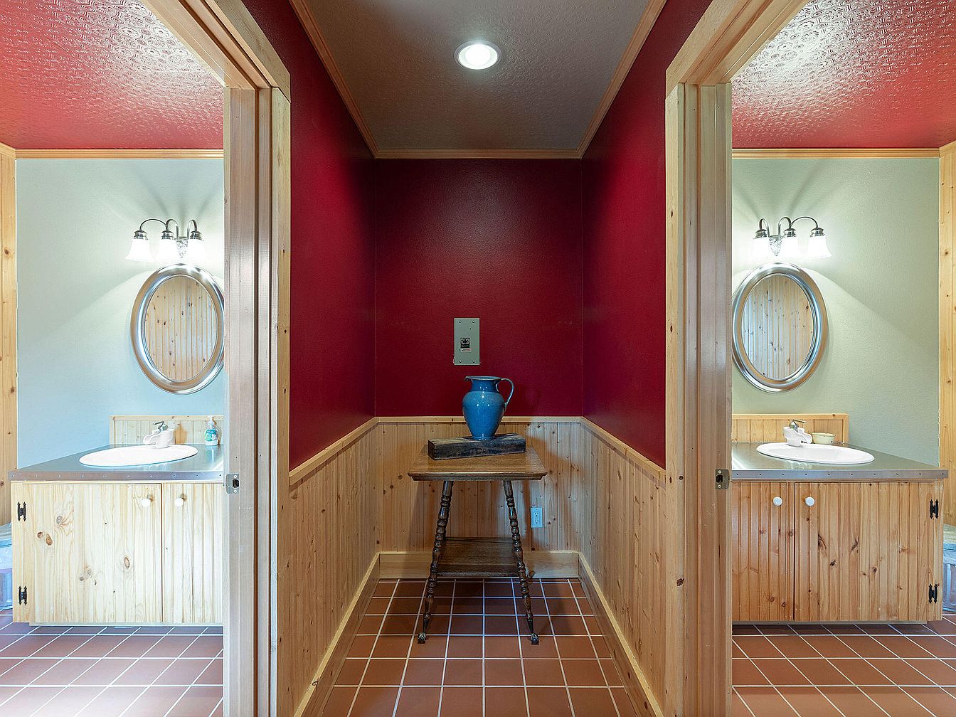 A spacious bathroom area with a divided layout, featuring two vanities on opposite sides. One side is adorned with a rich red wall, while the other displays a soft green hue. Both vanities have circular mirrors framed in wood, enhancing the natural aesthetic. Light fixtures above each sink provide warm illumination. Below the vanities, wooden cabinetry with a natural finish supports a metal countertop. A traditional wooden table stands centrally, topped with a vibrant blue vase, adding a pop of color. The floor consists of reddish-brown tile, harmonizing with the earthy tones of the wood and walls.