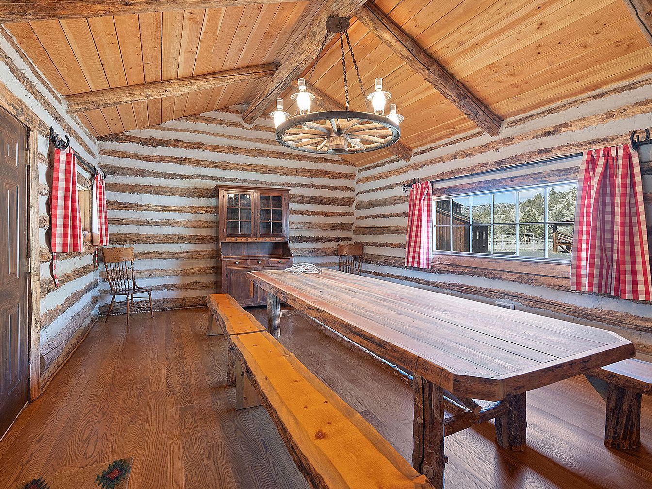 This rustic dining room features a long wooden table flanked by sturdy benches, crafted from rough-hewn timber, emphasizing the room’s natural aesthetic. Exposed wooden beams stretch across the ceiling, enhancing the cabin-like feel, while the walls showcase a unique log design, alternating between finished wood and exposed logs. Large windows adorned with red and white gingham curtains allow natural light to flood the space, providing views of the outdoors. A wooden china cabinet stands in the corner, displaying craftsmanship, while a hanging light fixture resembling a wagon wheel adds a charming, vintage touch.