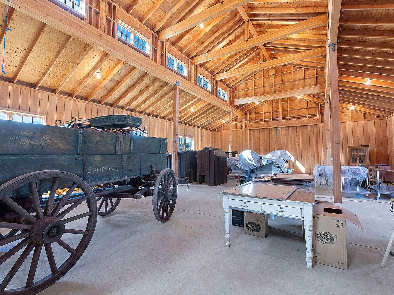 A spacious barn with a rustic charm features exposed wooden beams and a high ceiling, lending an airy atmosphere. The warm wood tones create a cozy ambiance, enhanced by natural light streaming through large windows. An old wooden cart with large wheels is prominently displayed, adding a nostalgic element. In the background, various pieces of furniture, shrouded in tarps, hint at a storied past. Concrete flooring complements the rustic aesthetics, while the combination of wooden paneling and the structured roof emphasizes the barn’s historical character, inviting visitors to explore its heritage and functionality.