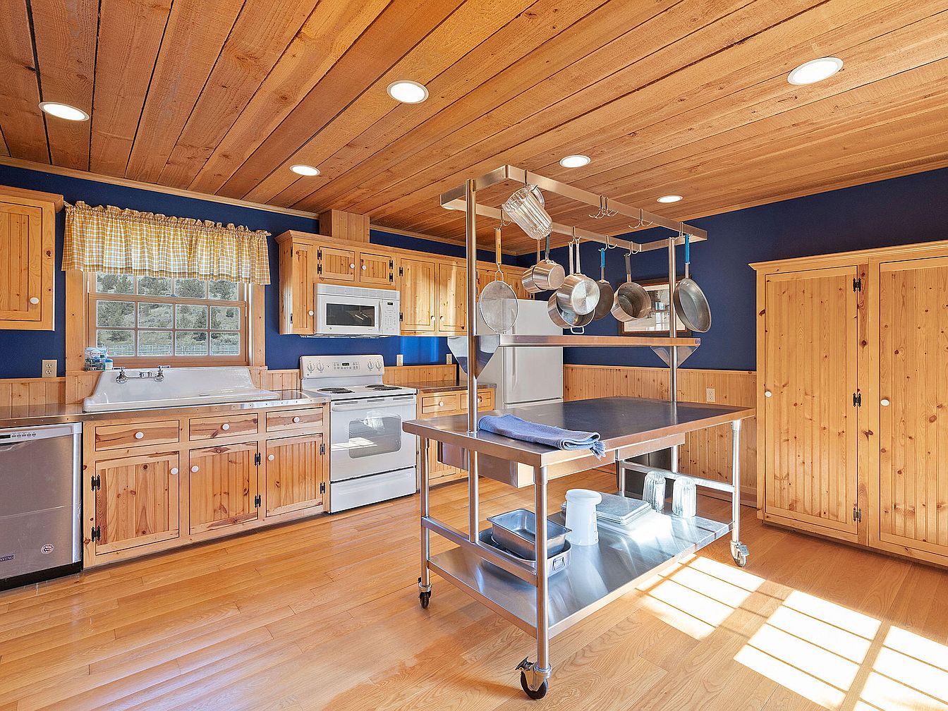 The kitchen features a warm, cozy aesthetic with rustic wooden cabinetry and ceiling. A rich blue wall contrasts beautifully with the light wood tones, enhancing the inviting atmosphere. Stainless steel appliances bring a modern touch, harmonizing functionality with charm. The spacious layout includes a central island on wheels with hanging pots, showcasing practicality for cooking enthusiasts. Sunlight streams through a large window, illuminating the polished wooden floor and creating a bright and airy feel. A checked curtain adds a playful, homey touch. Ample storage is provided by a tall cabinet, contributing to a well-organized space.