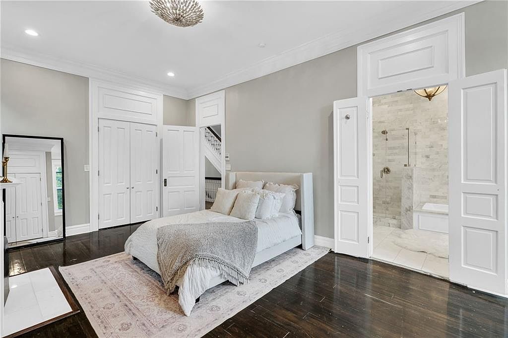 This serene bedroom features a plush gray upholstered bed adorned with decorative pillows and a textured throw, complemented by a stylish geometric area rug on dark hardwood flooring. A light gray wall creates a calming backdrop, while framed artwork adds visual interest. The elegant chandelier provides soft lighting, enhancing the overall ambiance. The layout includes a cozy ottoman at the foot of the bed and double doors opening to a sleek ensuite bathroom, which showcases modern tile work and a spacious shower. Ample natural light streams through the space, highlighting the harmonious design and inviting atmosphere.