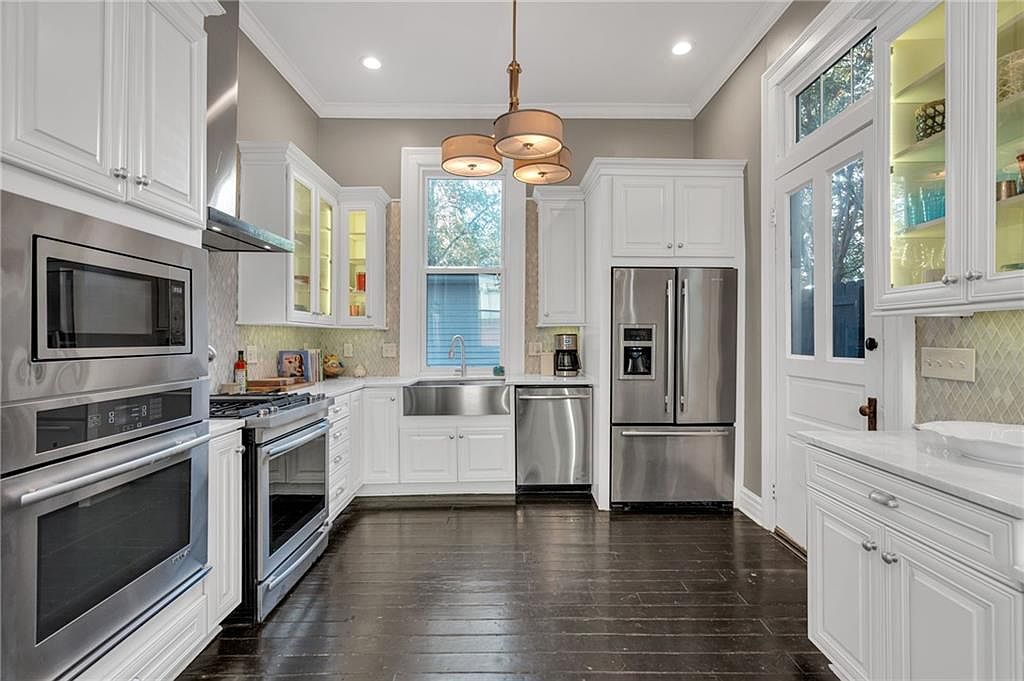 This kitchen showcases a modern aesthetic with a sleek, functional layout. Predominantly white cabinetry contrasts elegantly against the dark hardwood flooring, creating a bright yet warm atmosphere. Stainless steel appliances, including a gas range and built-in oven, enhance the contemporary feel. A large farmhouse sink is integrated into the countertop, paired with a high-arching faucet for convenience. The backsplash features a subtle, textured pattern, adding depth and sophistication. Ample natural light streams through the window, illuminating the space and highlighting the clean lines of the cabinetry and fixtures, reflecting a blend of style and practicality.