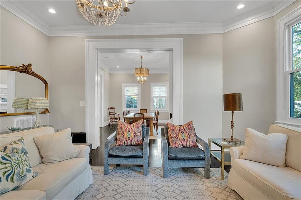 This cozy living room features a harmonious blend of modern and classic design elements. Soft beige walls complement the white crown molding, creating an airy atmosphere. A plush white sofa and two upholstered armchairs with vibrant, patterned cushions invite comfort. A unique side table holds a chic brass lamp, adding a touch of elegance. A large mirror with a decorative frame enhances the sense of space and light. Through the archway, a dining area is visible, showcasing a round table surrounded by wooden chairs. Warm lighting fixtures, including a chandelier and pendant lights, create a welcoming ambiance.