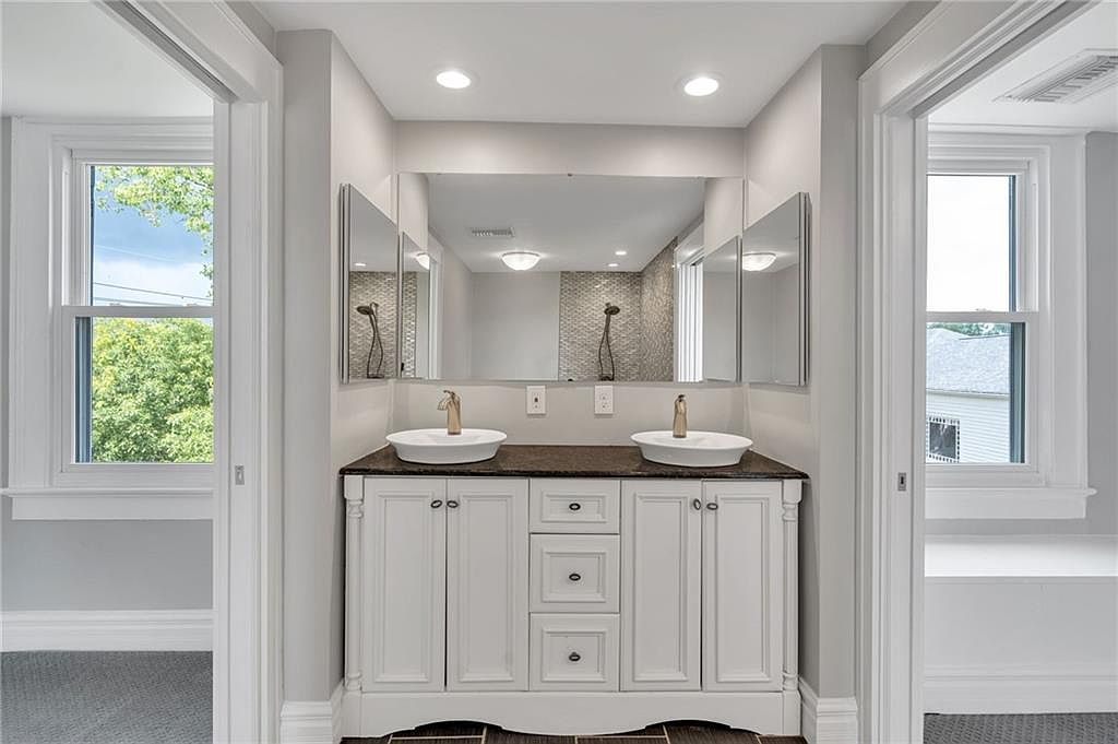 The space showcases a modern bathroom vanity with dual sinks, featuring sleek, white cabinetry beneath a dark granite countertop. Above the sinks, two large mirrors enhance the room’s brightness, reflected by recessed lighting. The fixtures, in a warm gold tone, contrast elegantly against the white and gray palette. Textured wall tiles add depth and sophistication in the background, while large windows invite natural light and provide picturesque outdoor views. Architectural elements like the molding and window frames offer a classic touch, blending contemporary design with traditional charm, creating a tranquil and inviting atmosphere.