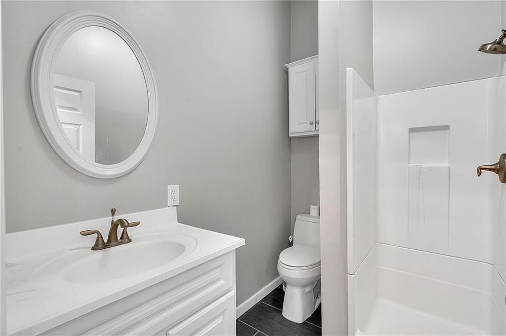 This bathroom features a minimalist design with a neutral color palette. Light gray walls enhance the sense of space, while the white cabinetry and countertop add a bright, clean look. A circular mirror with a white frame reflects natural light, making the area feel larger. The faucet is bronze, adding a touch of elegance. A compact toilet sits next to the shower, which has a smooth, white acrylic finish and modern fixtures. The dark tile flooring contrasts nicely with the lighter elements, providing visual interest while maintaining a sleek, functional aesthetic.