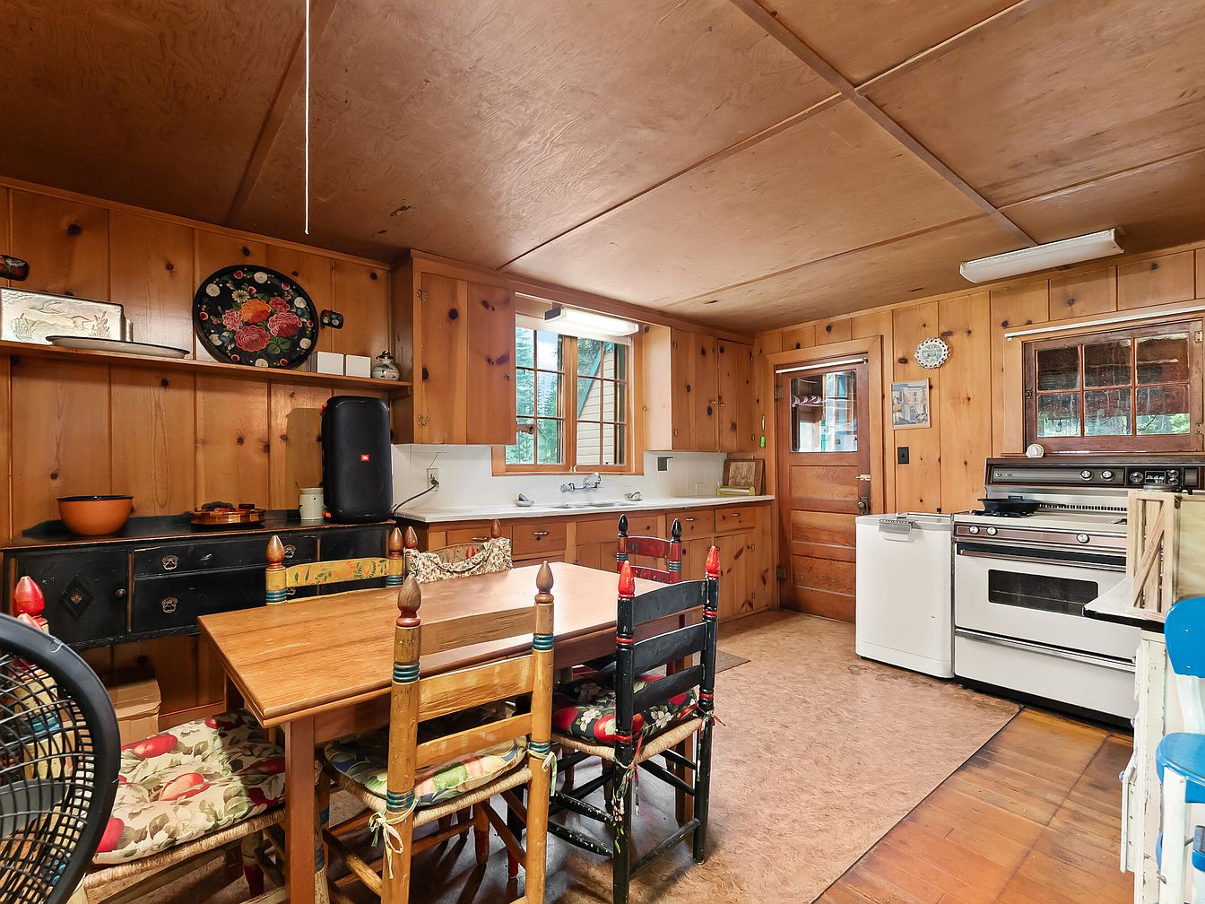 Warm, wood-paneled kitchen exudes coziness and charm, perfect for family gatherings. Natural wood walls and ceiling create a cabin-like ambiance, complementing a spacious, light-filled layout. The kitchen features ample countertop space with a classic white sink beneath a double window, allowing sunlight to brighten meal prep. A wooden dining table with four cushioned chairs sits at the center, ideal for shared meals or crafts with children. The vintage stove, white appliances, and decorative shelf accents add to the room’s welcoming, lived-in feel. A back door and cheery touches make this a comfortable, practical, and inviting heart of the home for all ages.