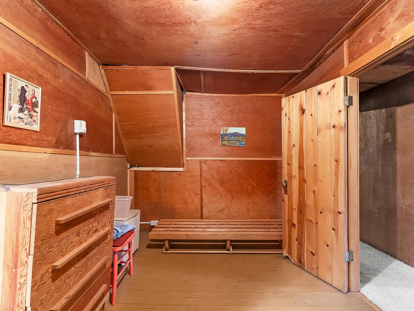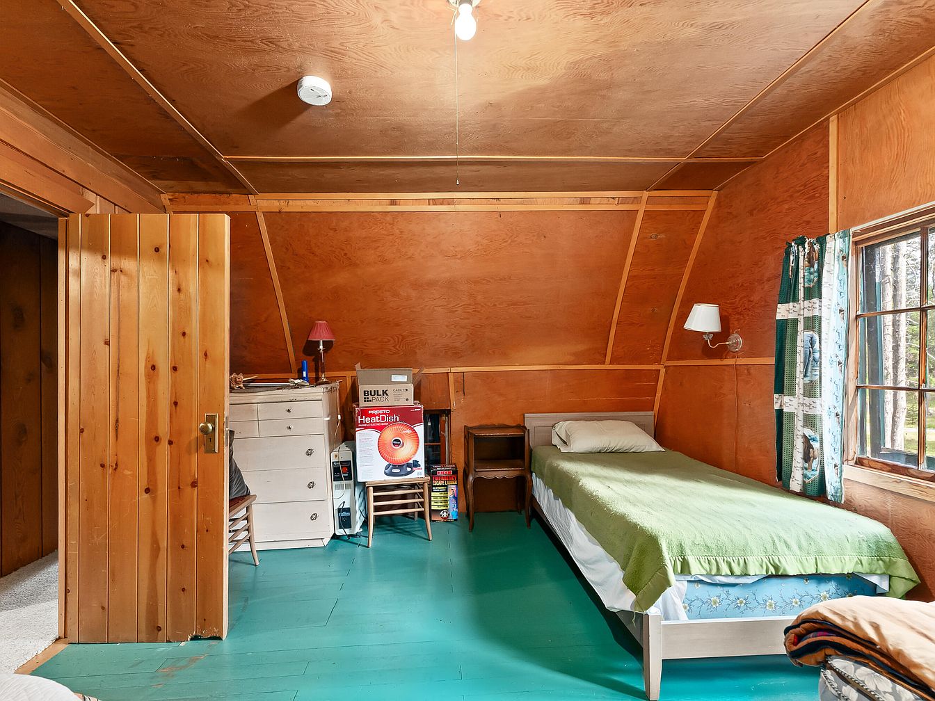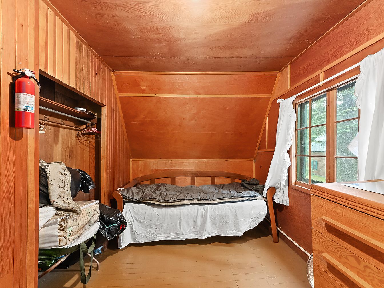 Warm wooden paneling lines the walls and ceiling of this attic-style bedroom, creating a snug and welcoming environment ideal for family living. Natural light streams through a broad window dressed with ruffled white curtains, brightening the space and showcasing outside greenery. A single bed with a wooden headboard sits against one wall, enhanced by simple bedding in neutral tones. A curtained-open closet offers practical storage, with shelves and hanging space. Across from the bed, a sturdy wooden dresser provides additional storage. The room’s inviting, rustic ambiance and functional layout make it a comfortable, safe retreat for family members.