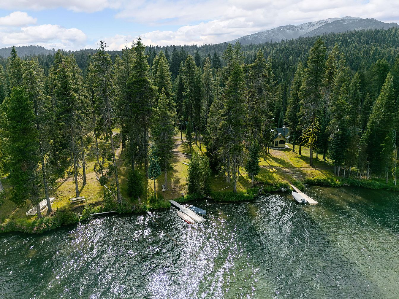 A tranquil lakeside community nestled among tall evergreen trees, featuring several docks that extend into the calm, green-blue water. Clustered cabins and homes are spaced out along the natural shoreline, providing privacy and a connection to nature. The area offers gentle trails and open spaces, perfect for family strolls or outdoor play. The waterfront’s natural aesthetic is highlighted by the lush forest backdrop and distant mountain views, creating an ideal retreat for families seeking both adventure and relaxation. Boats at the docks suggest recreational opportunities and a welcoming, active family environment.