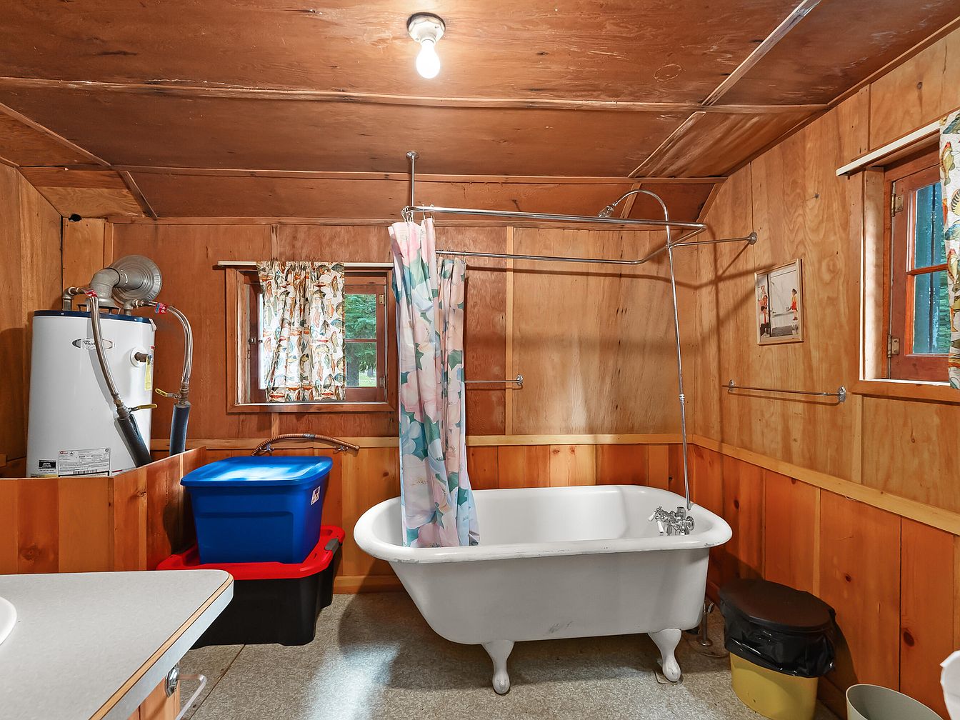 A spacious, rustic-style bathroom featuring warm, honey-toned wooden walls and ceiling, creating a cozy atmosphere ideal for family living. At the center, a classic white clawfoot bathtub with a floral shower curtain adds vintage charm and comfort, perfect for bathing children or relaxing after a long day. Several windows with cheerful patterned curtains bring in plenty of natural light. Practical features include ample towel bars, a water heater tucked neatly in a corner, and storage bins for easy organization. A soft neutral countertop is visible, reflecting functionality. The overall design feels inviting, practical, and well-suited for a busy family’s needs.