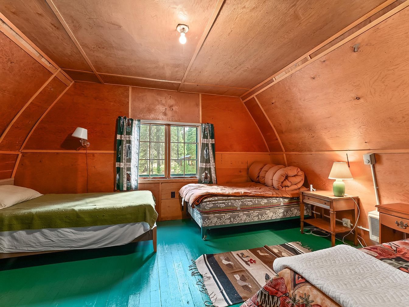 This inviting bedroom features three beds arranged for maximum comfort, ideal for families or groups. The space has charming angled wooden walls and ceiling with natural wood grain, giving it a rustic, cabin-like feel. A large window at the end lets in natural light and provides tranquil views of greenery outside, perfect for a peaceful atmosphere. The room includes a small green lamp on a wooden nightstand, colorful patterned area rugs on a teal-painted wooden floor, and simple, cheerful bedding. Curtains with nature-inspired motifs add character, and the overall layout encourages family gathering and restful nights.