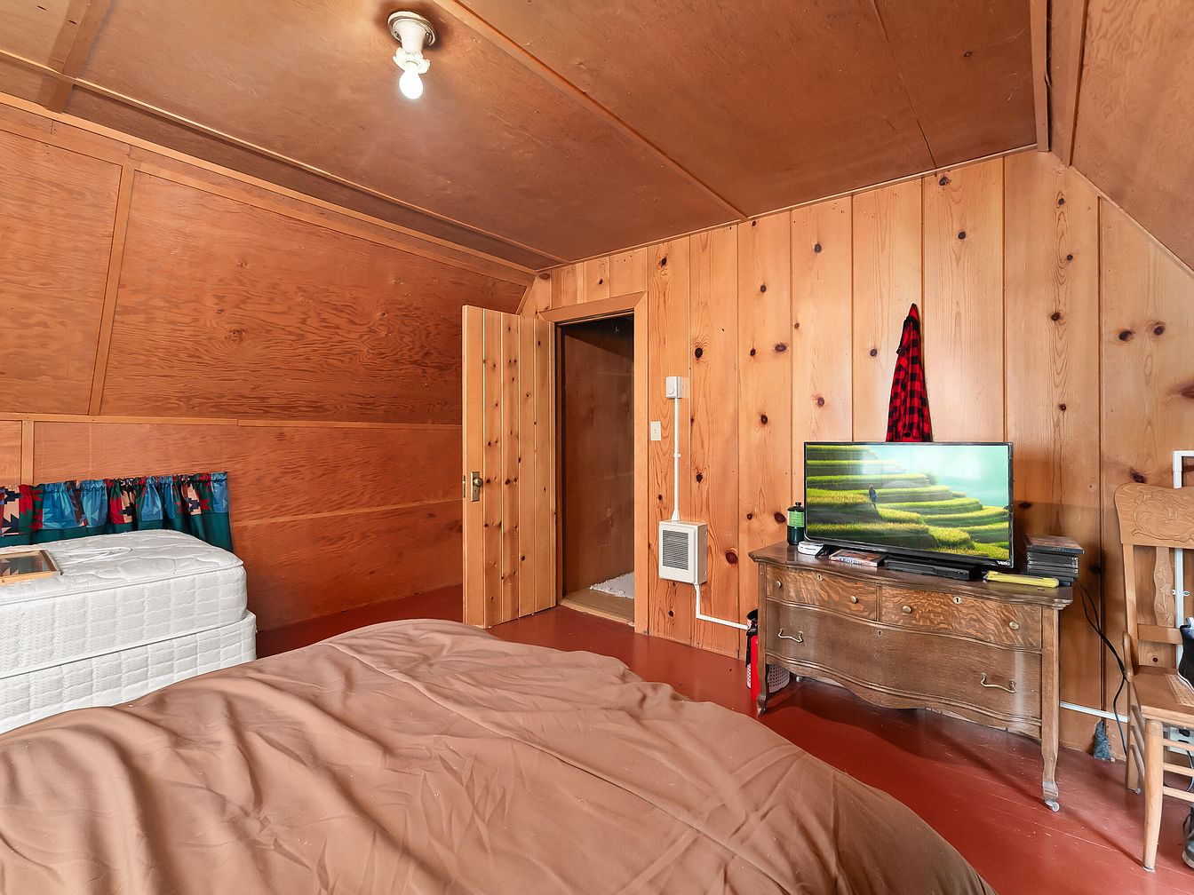 Warm wood paneling covers the walls and ceiling, creating a cozy and rustic ambiance in this family-friendly bedroom. Natural wood tones dominate the space, paired with a red-brown painted floor that enhances the inviting feel. The room features a comfortable bed with a tan comforter and extra mattresses stacked by the window, ideal for accommodating kids or guests. A vintage wooden dresser holds a modern flat-screen TV, blending classic and contemporary elements. The layout is open and functional, with minimal clutter and easy-to-clean surfaces, making it suitable for a growing family. Colorful curtains add a playful touch near the sleeping area.