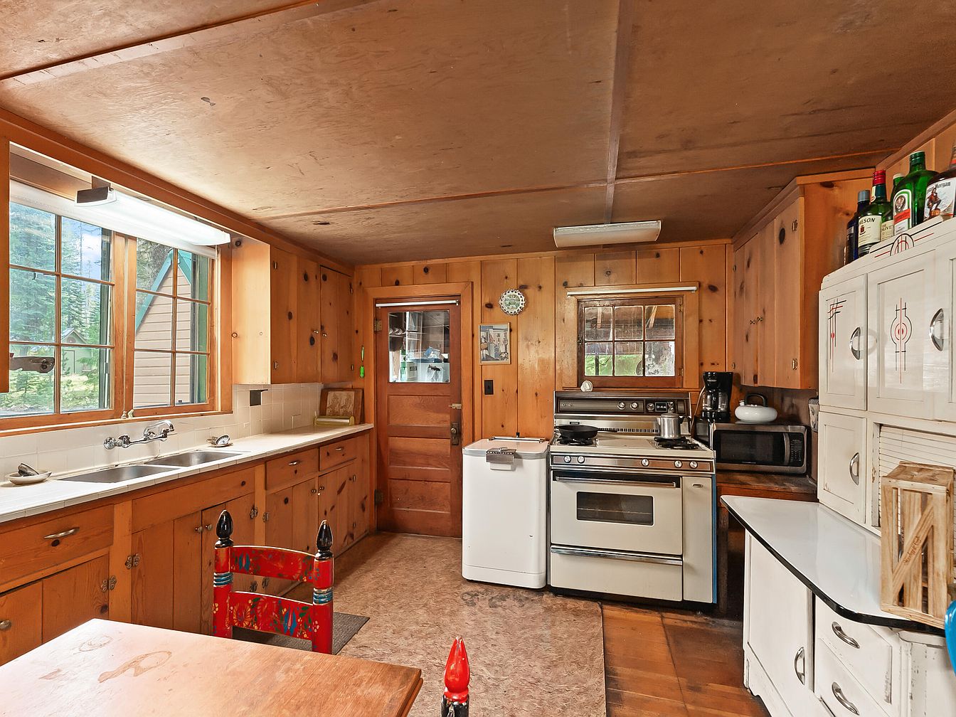 Warm wooden paneling covers the walls and ceiling, creating a rustic and inviting kitchen ideal for family gatherings. Natural light flows in from the large windows above a twin stainless steel sink, brightening the space and offering a pleasant outdoor view. The kitchen features sturdy wooden cabinetry, classic white countertop, and a vintage gas stove, blending functionality with nostalgic charm. An old-fashioned hutch provides storage with distinctive geometric inlays. Simple furnishings include a vibrant red chair at a wooden table, perfect for family meals or children’s activities. Spacious counters and easy-to-clean surfaces make this kitchen both practical and welcoming for family life.
