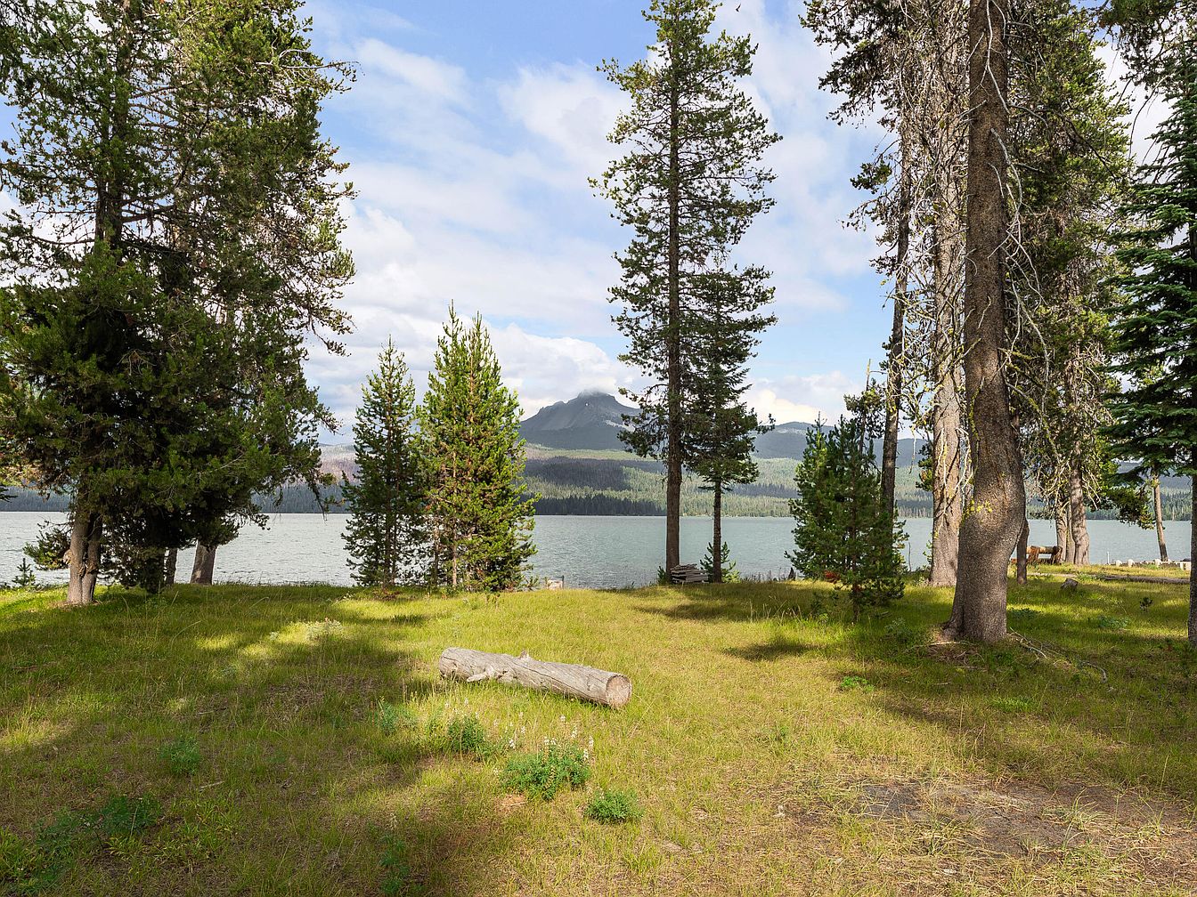A tranquil backyard opens to a scenic lake, framed by a grove of tall pine trees, providing ample shade and natural beauty. The grass is lush and well-kept, making it an ideal space for children to play or for family gatherings and picnics. A weathered log rests on the green lawn, offering a rustic place to sit and enjoy the view. Beyond the yard, the calm lake reflects the sky, with distant forested mountains adding to the picturesque, peaceful setting. The open layout and connection to nature make this backyard perfect for relaxation and family-friendly outdoor activities.