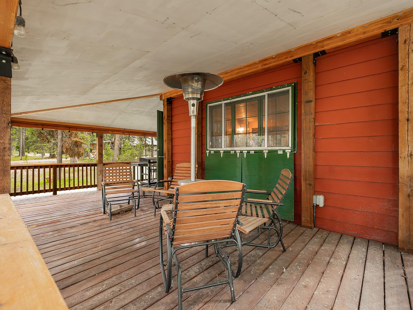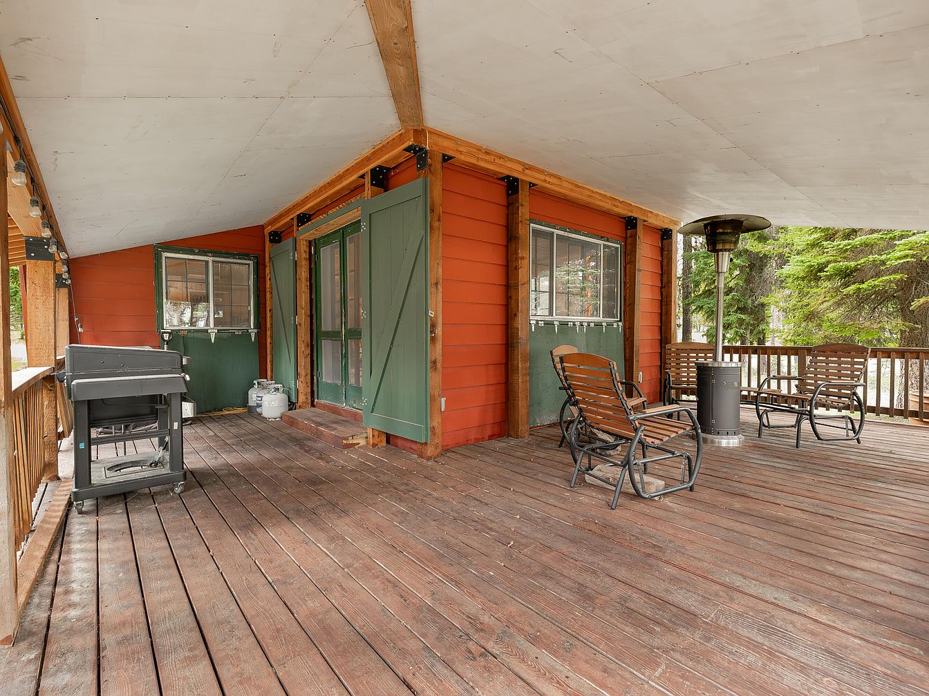 A spacious, covered patio with warm reddish-brown wooden planks sets a welcoming tone for outdoor family gatherings. The house exterior features rustic orange-red siding paired with bold green barn-style doors and window shutters, offering a charming cabin feel. Several sturdy lounge chairs are arranged around a portable patio heater, providing comfortable seating for adults or children and making the space suitable year-round. A large grill sits to one side, perfect for family barbecues. Overhead, a protective pale ceiling provides ample shade, and the surrounding wooded scenery brings natural serenity, making this an inviting extension of the home for all ages.