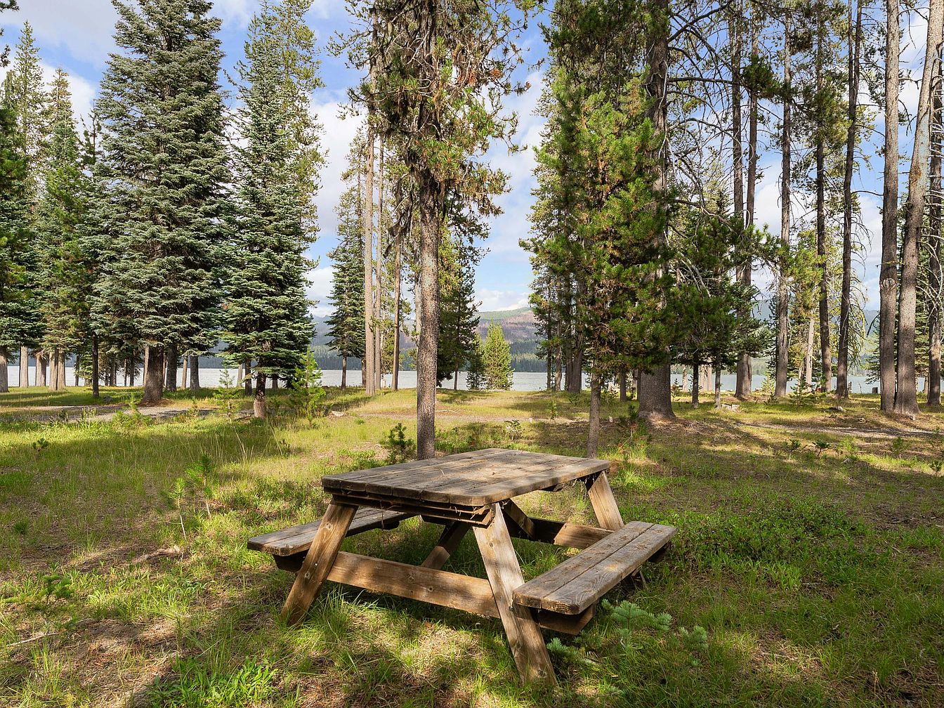 Nestled among tall pine trees, the backyard picnic area features a rustic wooden picnic table set on a grassy clearing, perfect for outdoor family gatherings. The open layout provides ample space for children to play and families to relax together. Natural light filters through the trees, creating a serene and inviting atmosphere. The color palette is dominated by lush green grass, deep forest tones from the trees, and the natural wood hues of the table. In the distance, a tranquil body of water and mountains add to the scenic beauty, making it an ideal spot for family meals and nature enjoyment.