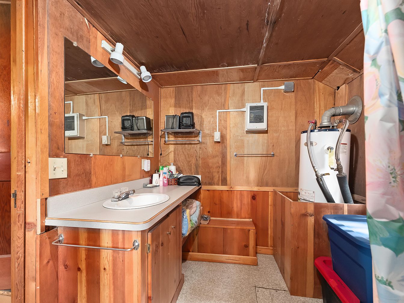 Warm wood paneling covers the walls and ceiling, creating a rustic, cabin-like feel in this bathroom utility space. A long countertop features a single sink with practical fixtures and a large mirror above, reflecting both natural and artificial light. Ample shelving offers convenient storage for family toiletries and essentials. To the right, a white water heater and utility area are partially screened by wooden partitions and a colorful floral shower curtain. The neutral beige countertop pairs well with the natural wood tones, and sturdy cabinetry provides additional storage, making this a practical, family-friendly space that is organized and easy to keep clean.