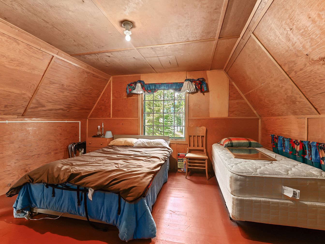 A cozy attic bedroom features two beds—a double and a twin—arranged against warm, natural wood-paneled walls and angled ceilings, creating a welcoming and rustic atmosphere. The room includes a wooden chair next to the window, which brings in soft daylight and offers a peaceful view of greenery outside. Colorful curtains and bed linens add a touch of color, complementing the earthy tones of the wood and the red-painted floor. Practical elements like a small bedside table with a lamp, plus ample open space, make it ideal for siblings or guests, promoting a family-friendly, relaxed ambiance.
