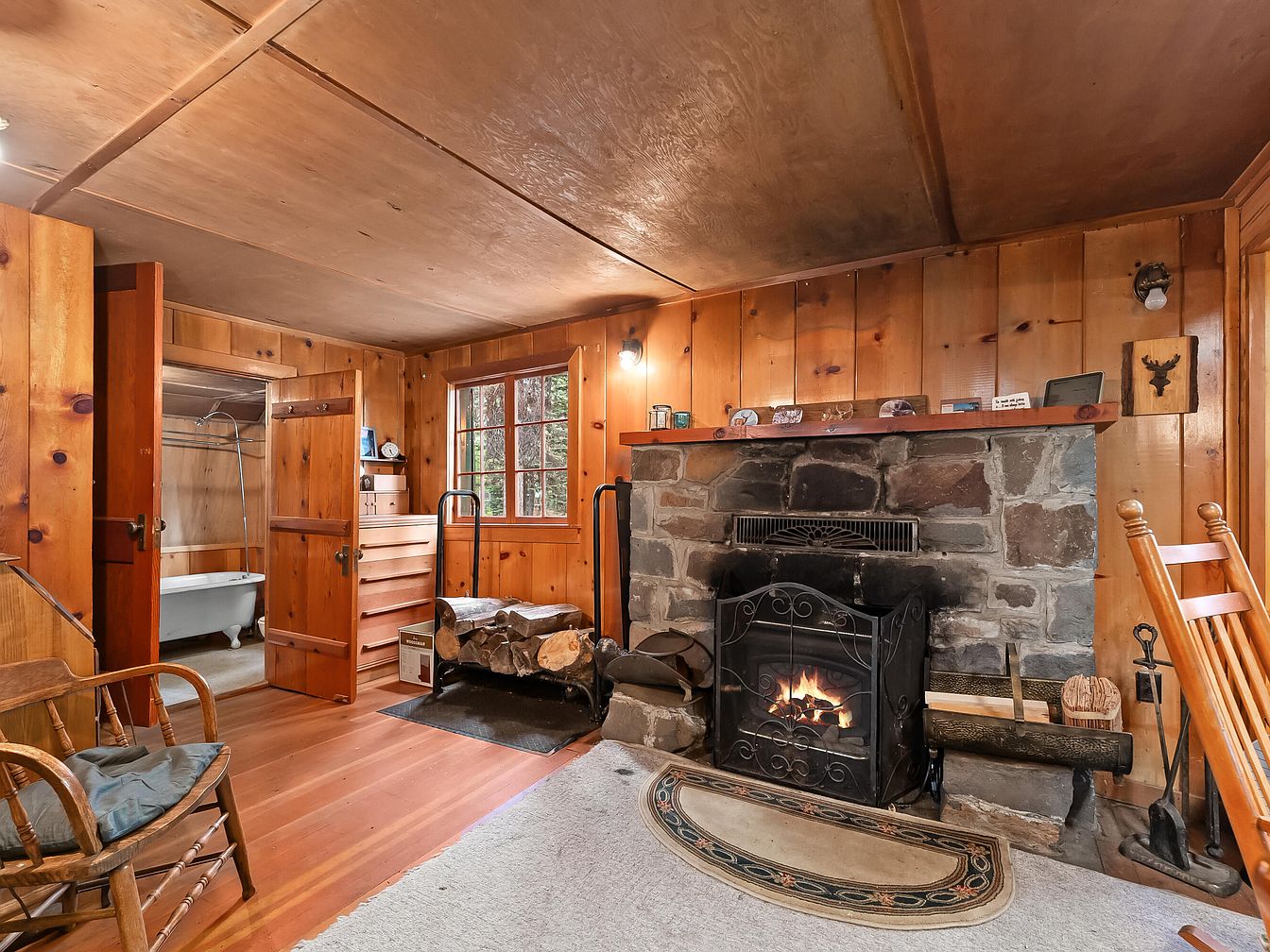 A cozy, family-friendly living space featuring a rustic stone fireplace as the central focal point, complete with a warm fire and a decorative metal screen. Knotty pine wood paneling lines the walls and ceiling, lending a welcoming cabin-like charm. The hardwood floors are topped with a soft area rug, and rocking chairs and wooden furniture add comfort for all ages. A stack of firewood and various fireplace tools sit conveniently nearby. Ample natural light filters in through a multi-pane window, while an open doorway reveals a classic clawfoot tub in the adjacent bathroom, highlighting the home’s inviting, practical layout.