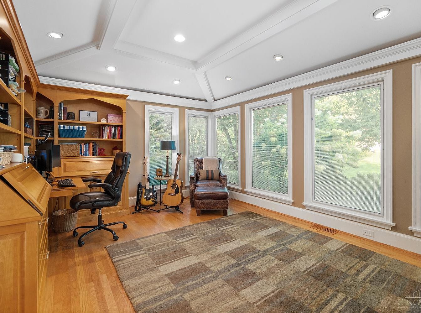 A warm, inviting home office features walls painted in a soft tan shade, contrasted with crisp white trim and a coffered white ceiling adorned with recessed lighting. One side of the room boasts custom built-in wooden shelves and a desk, equipped with a computer and office chair. An oversized window seat area occupies the opposite wall, highlighted by a row of tall windows that fill the space with natural light and provide lush views of greenery outside. A muted geometric rug in earth tones covers the hardwood floor, while guitars next to an upholstered leather chair and ottoman add a relaxed, creative touch.