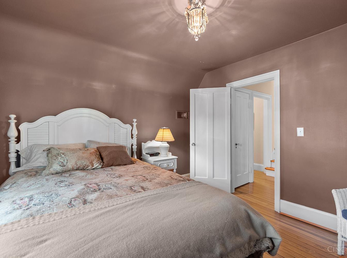A cozy bedroom featuring warm, cocoa-toned walls and a matching ceiling, giving the space a soothing and enveloping feel. A large white wooden bed with a decorative headboard sits to the left, dressed in a paisley-patterned comforter and an assortment of pillows in neutral and muted tones. Beside the bed is a classic white nightstand topped with a lamp emitting a gentle, golden light. The wooden floor has a honey finish, offering contrast to the darker walls. White trim and doors brighten the space, and a sparkling vintage chandelier hangs from the ceiling, adding elegance. An open door reveals a hallway and stairway beyond.