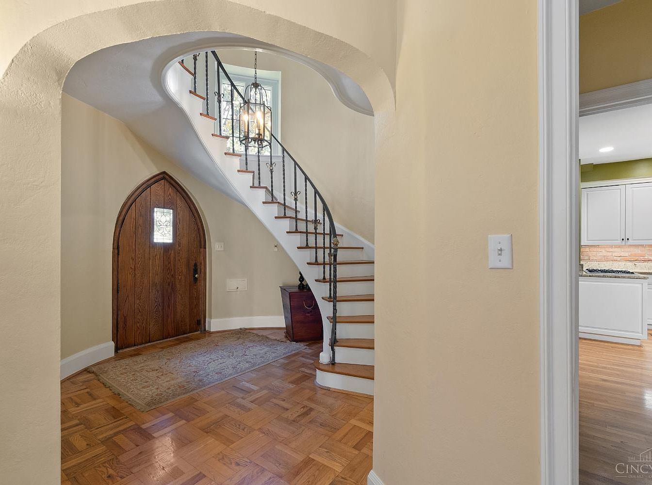A curved staircase with dark wooden steps and ornate wrought iron railings sweeps up from the entryway. The foyer features honey-toned parquet wood flooring and creamy beige walls with rounded archways, giving a classic and welcoming ambiance. A vintage, arched wooden front door with leaded glass offers character and charm, complemented by a narrow area rug near the entrance. Overhead, a brass and glass lantern-style pendant light adds a touch of elegance. Natural light streams in from the stairwell’s window, highlighting the intricate architectural details and inviting layout, evoking a sense of historic sophistication.