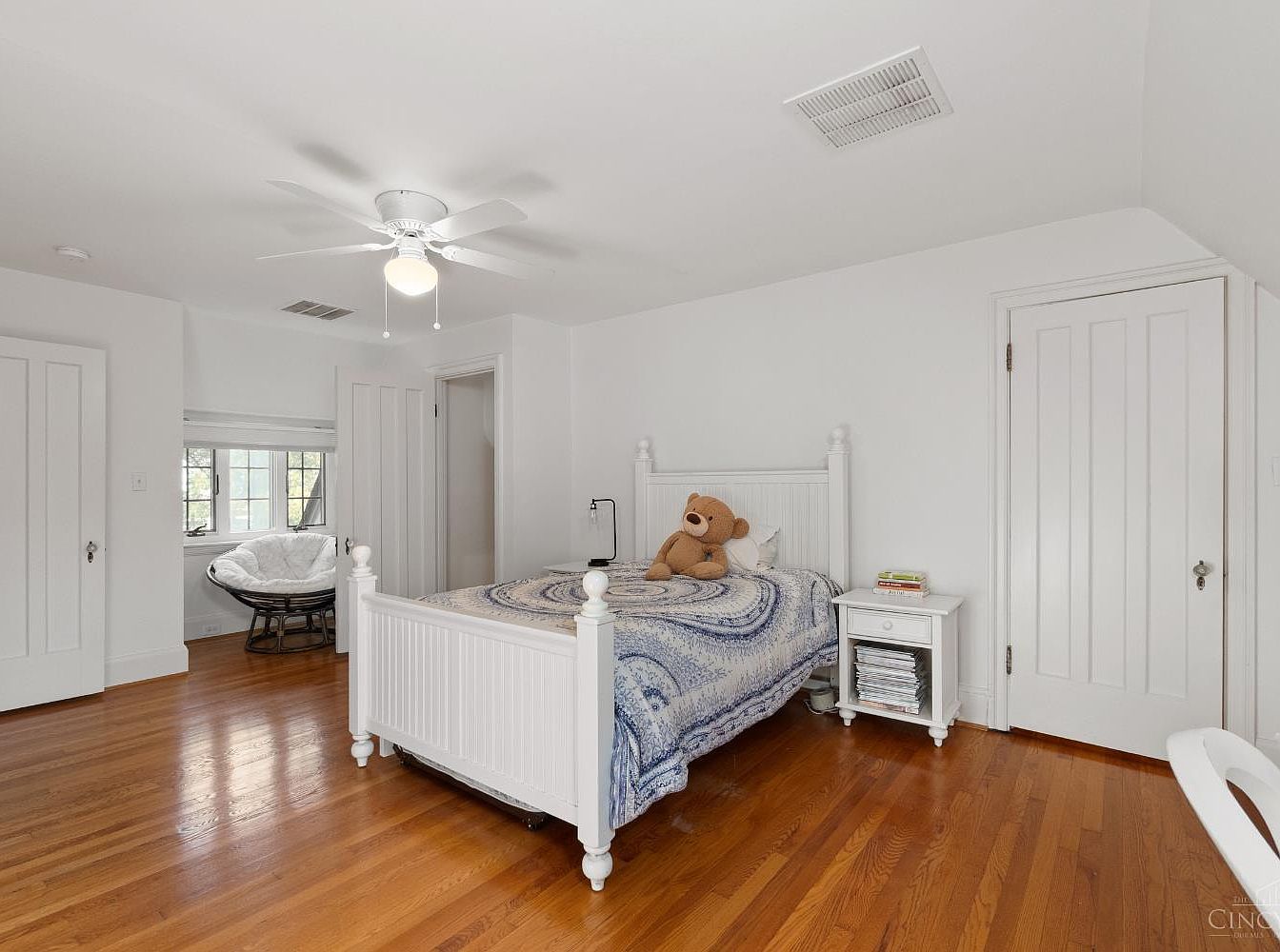 A spacious, bright bedroom features gleaming medium-toned hardwood floors and crisp white walls, creating a fresh, airy atmosphere. At the center, a white wooden bed with decorative posts is dressed in a blue and white swirling patterned blanket, topped by a large plush teddy bear. Beside the bed is a simple white nightstand stacked with books and a small reading lamp. A ceiling fan with a light fixture hangs above, adding to the comfort. Multiple doors, paneled in white, line the walls, while a cozy round papasan chair with a white cushion is placed in a nook near a large window, inviting relaxation and natural light.