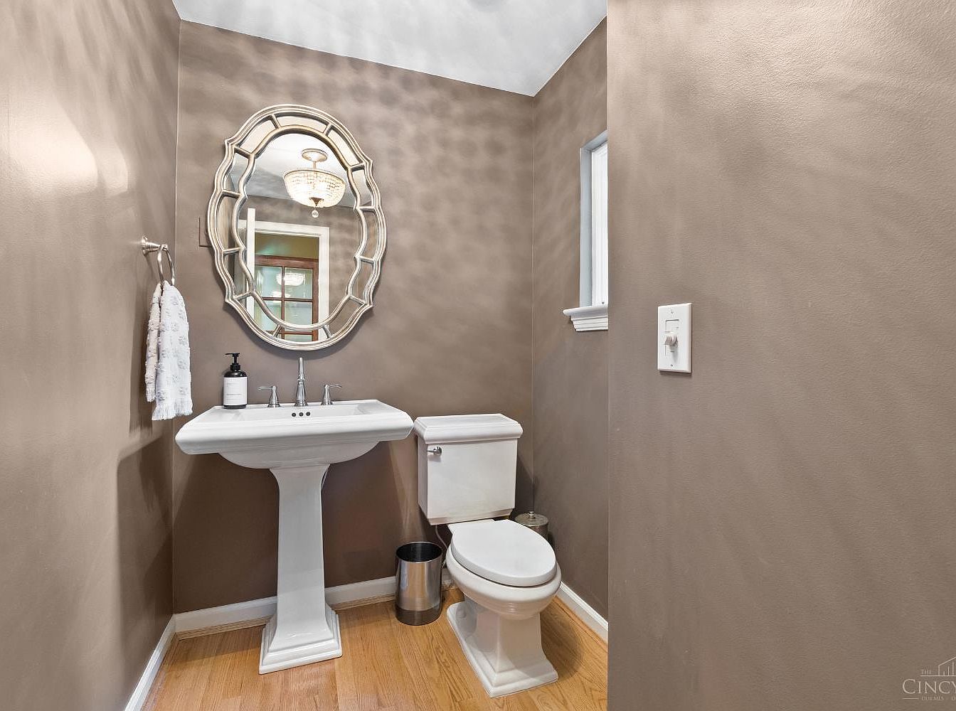 A small bathroom features warm beige walls and light wood flooring, creating a cozy atmosphere. A classic white pedestal sink with chrome fixtures stands next to a matching white toilet. Above the sink, an ornate, scalloped oval mirror with a metallic frame reflects a stylish chandelier and doorway, adding elegance. A hand towel hangs from a simple ring by the sink, while a silver waste bin is tucked beside the toilet. Natural light enters through a small, high window with a painted white ledge, and a white wall switch adds modern convenience. Clean lines and subtle patterns blend traditional and contemporary design elements.