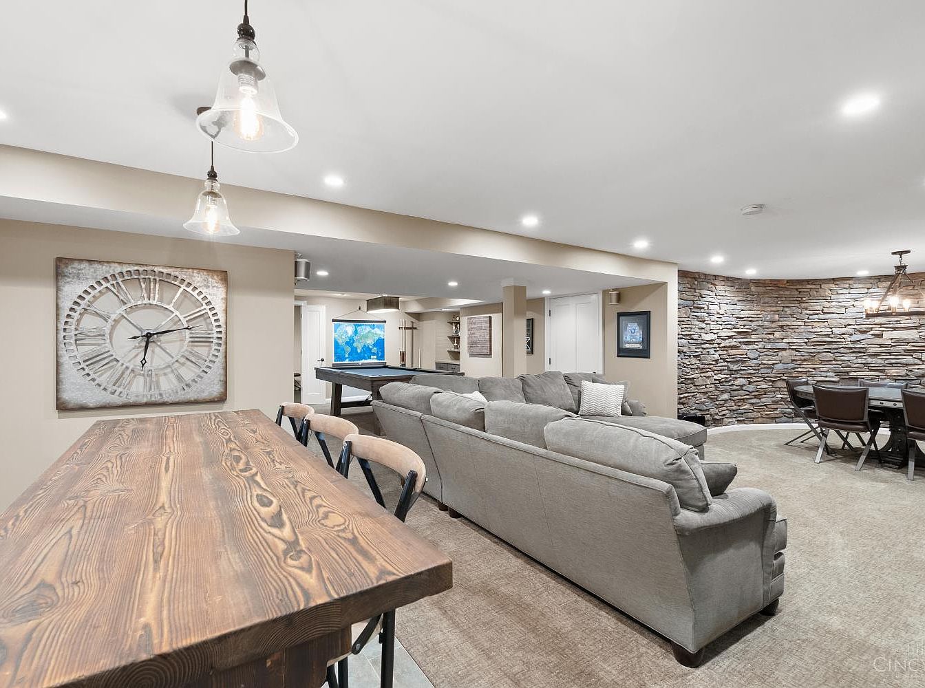 This spacious basement lounge area features an inviting blend of comfort and rustic charm. A large L-shaped gray sectional dominates the seating space, offering ample room for relaxation. Adjacent is a high wooden table with bar stools, beneath contemporary glass pendant lights. The walls are painted in a soft beige, complemented by an accent wall of stacked stone that adds texture and warmth. Additional accents include a large decorative wall clock and framed artwork. The plush carpet, recessed lighting, and corner setup for game tables make this an ideal spot for gathering, entertainment, and leisure.