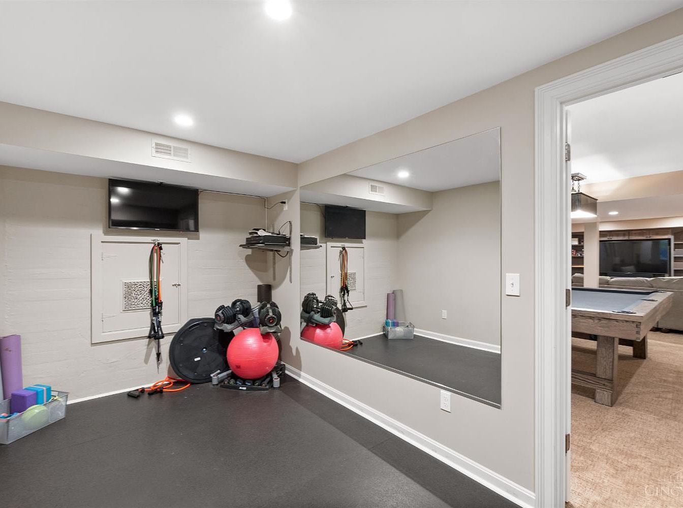 A small discreet fitness area is set in a corner of a finished basement, distinguished by soft beige walls and a smooth, black rubber floor for exercise. The back wall features a large, seamless mirror that expands the sense of space and reflects workout equipment. A TV and storage shelf are mounted above a recessed vent, while various hand weights, resistance bands, and a vibrant pink exercise ball are arranged tidily. Yoga mats, blocks, and accessories rest to one side in a clear bin. Bright recessed ceiling lights deliver crisp illumination and an open doorway leads to a recreational space with a pool table.