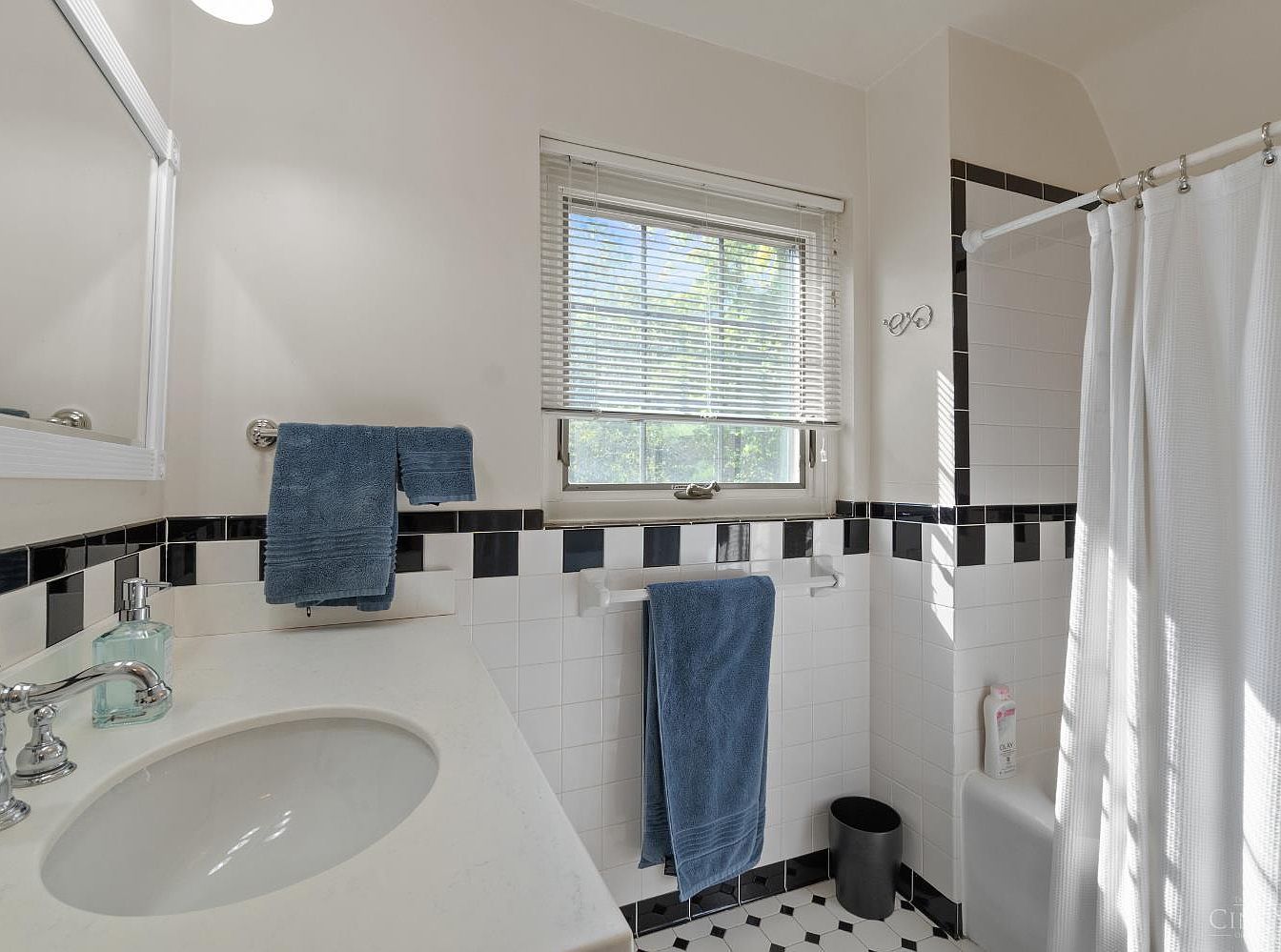 A compact bathroom features a black-and-white color scheme with classic retro tiles running midway up the walls, topped with a glossy black border. The white vanity has a gentle curve and an oval sink accented by a chrome faucet. Blue hand and bath towels add a pop of subtle color, complementing a light, airy feeling. A small soap dispenser sits next to the sink, while a large window above the towel rack brings in natural light. The shower area is curtained in crisp white, and a small metal trash bin sits neatly in the corner, enhancing the overall tidy appearance.
