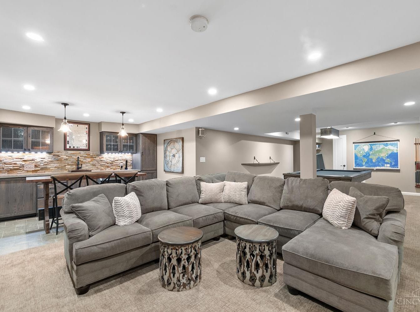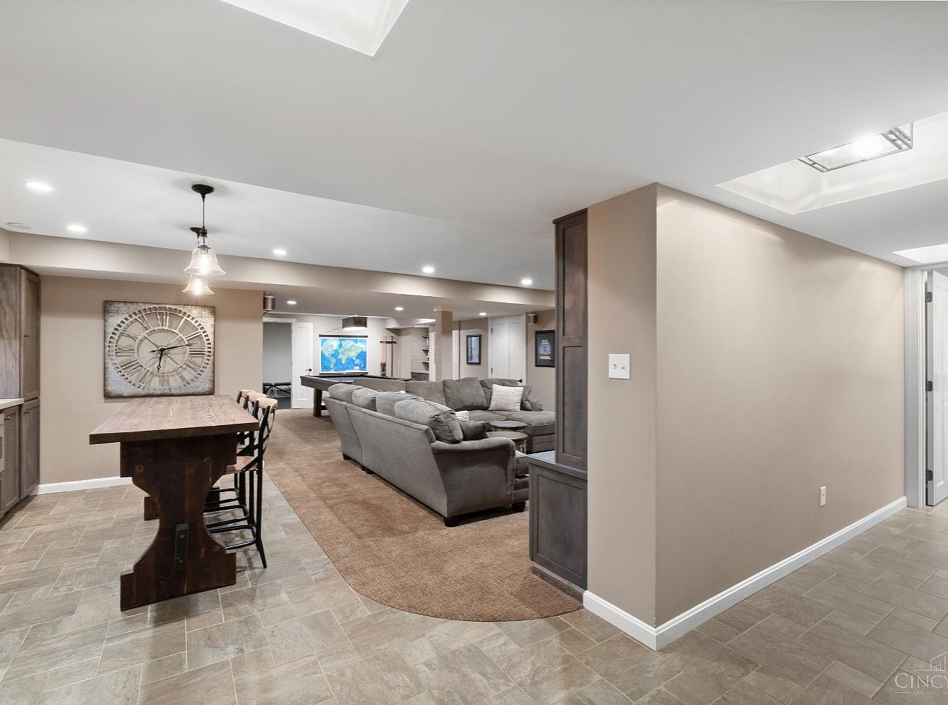 An expansive, open-plan basement with a comfortable and versatile layout. Soft beige walls and light gray tile floors frame the space, with a section of plush tan carpet demarcating the lounge area. A large, L-shaped gray sectional sofa with multiple pillows creates a cozy conversation zone facing a wooden coffee table. To the left, a rustic wooden table with high chairs sits beneath pendant lighting, perfect for casual dining or entertaining. Decorative touches include a large wall clock and built-in cabinetry with dark wood finishes. Bright, recessed lighting and skylight panels keep the basement feeling inviting and airy.