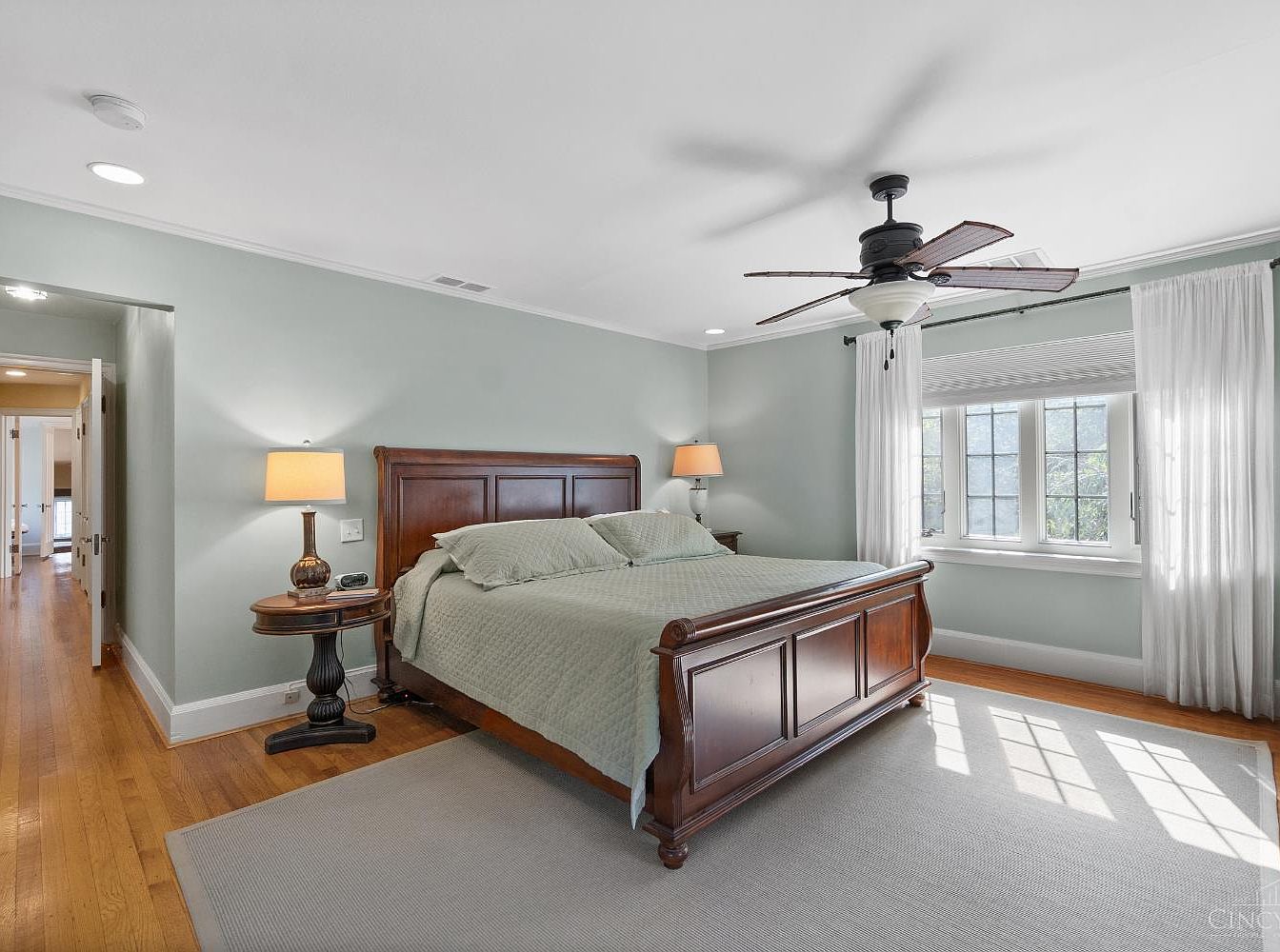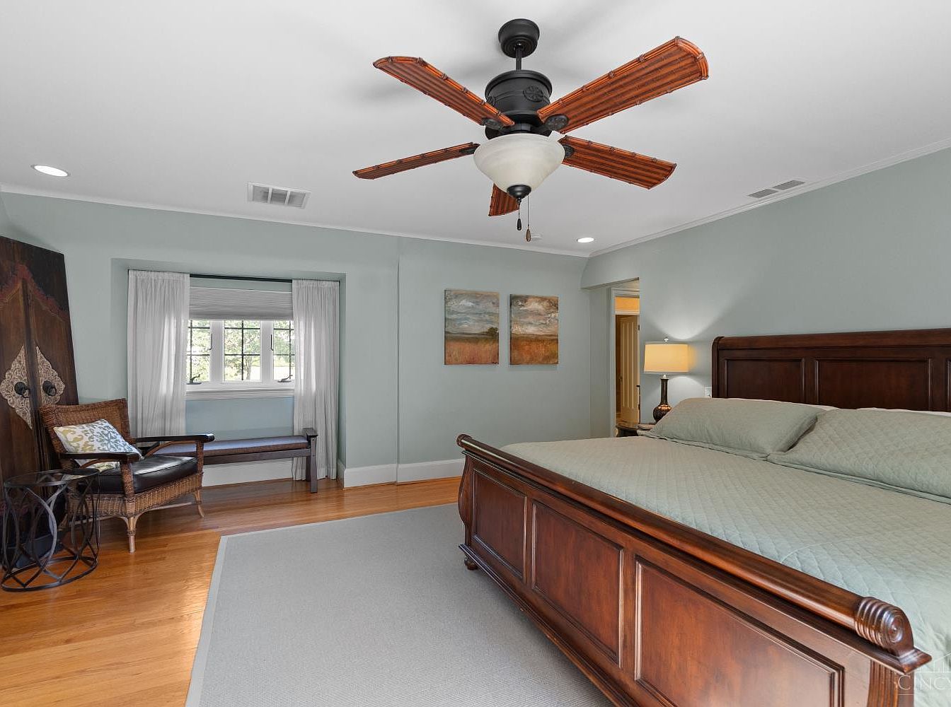 A spacious bedroom features soft sage green walls, white trim, and warm hardwood flooring. A large, elegant wooden bed with a matching footboard sits in the center, dressed in light green bedding and flanked by two round nightstands, each with a classic lamp. The far wall includes a set of multi-paned windows with natural light streaming in, lined with sheer white curtains. A ceiling fan with dark wood blades hangs above the bed. The overall look blends traditional wooden furniture with calming, airy colors, creating a serene and welcoming retreat. Hallway access appears on the left side.