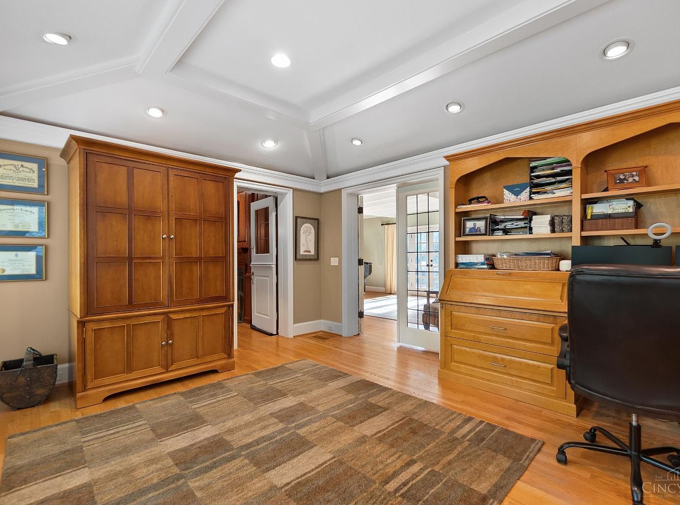 A spacious home office features honey-toned wood furniture, including a large cabinet on the left and a built-in desk with bookshelves on the right. The room’s floor showcases light hardwood, partially covered by a geometric area rug with earth-tone shades of brown and beige. The walls are painted a warm taupe, accented with white crown molding and paneled ceiling beams. Recessed lighting provides ample illumination. On one wall, framed diplomas are arranged vertically. There are two doors, one white and one glass-paneled, leading to other rooms, enhancing the open and airy feel of the workspace.