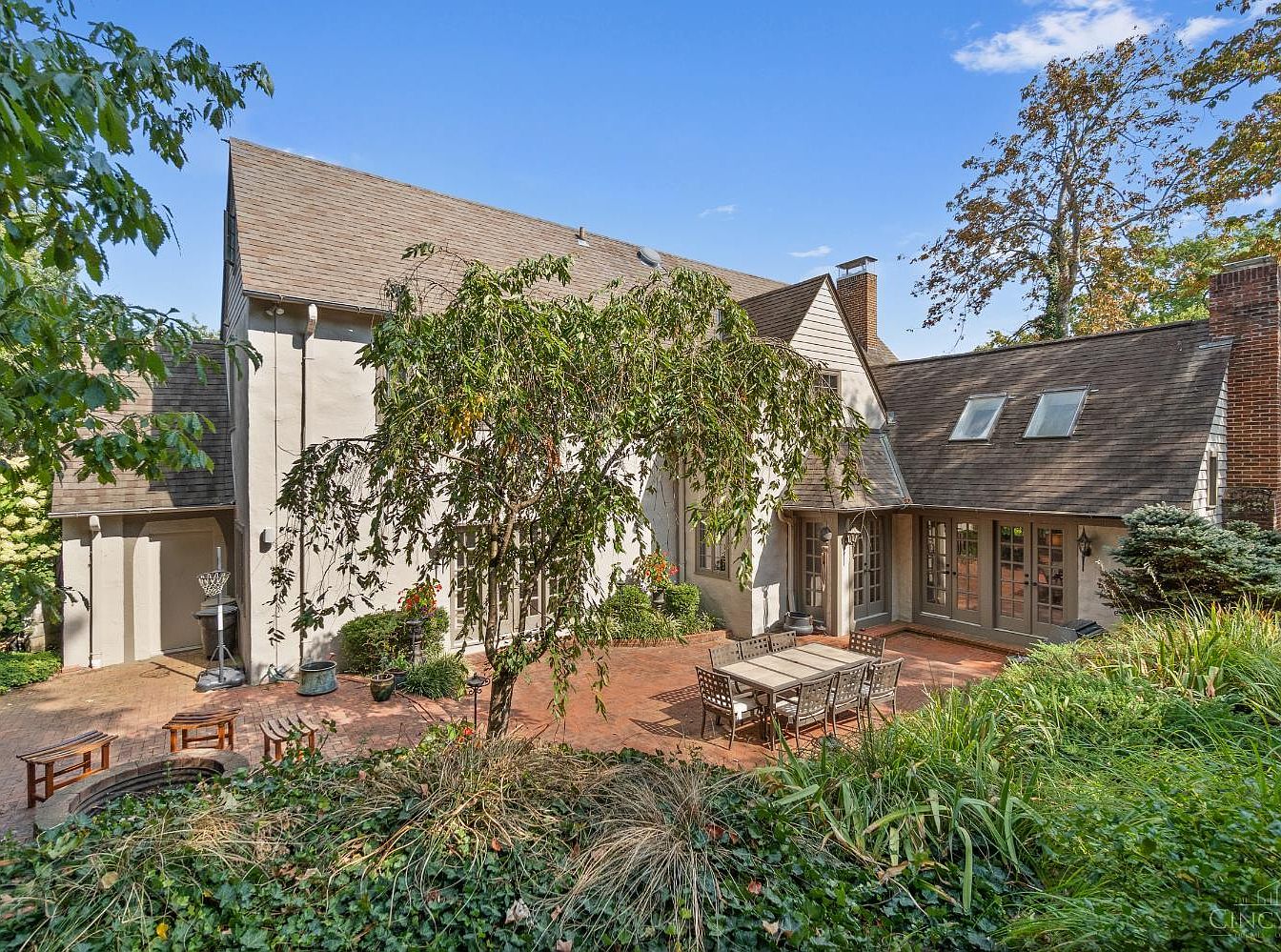 A spacious brick patio is set against the rear façade of a historic home, bordered by lush landscaping and mature trees. The house features steeply pitched shingle roofing with gabled dormers and skylights, as well as multiple windows and French doors with soft taupe trim that open onto the patio area. At the center of the patio, a large metal dining table with seating for eight invites outdoor gatherings. Decorative potted plants and garden benches are thoughtfully arranged along the edges, creating a warm, relaxed ambiance. Ivy and ornamental grasses provide natural texture and soften the architectural lines.