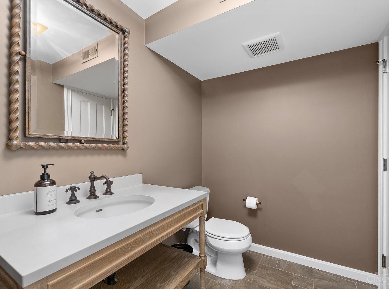 This compact bathroom features warm taupe walls and a light beige tiled floor, creating a cozy and neutral atmosphere. A classic wooden vanity with an open shelf underneath is topped by a crisp white countertop and oval sink. The faucet is bronze, coordinating with the bronze soap dispenser and standing out against the lighter elements. Above the vanity, a large, square mirror with a bold, twisted wood frame adds a rustic touch. To the right, a simple white toilet sits against the wall, complemented by a chrome toilet paper holder. Recessed lighting and an overhead vent complete the space, enhancing its practicality.
