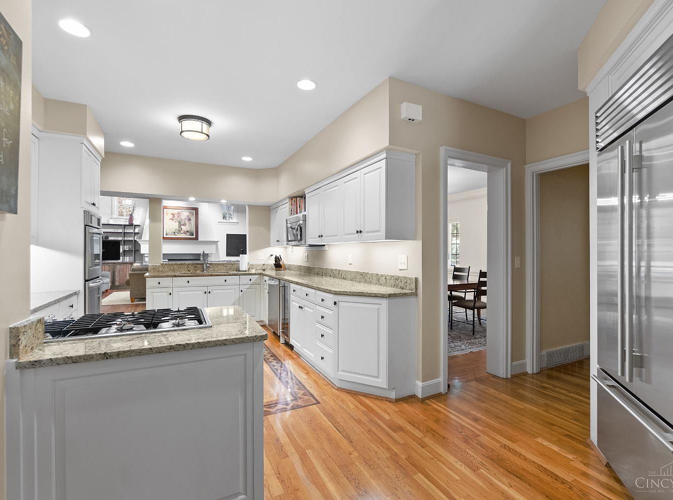 Spacious kitchen with a U-shaped layout, featuring light wood flooring and ample white cabinetry with classic panel details. Granite countertops run along both sides, creating generous workspace and a breakfast bar at the stove. Neutral beige walls and recessed lighting add warmth and brightness. Stainless steel appliances, including a double oven and a large refrigerator, lend a modern touch. The kitchen opens into a cozy living space adorned with artwork above the fireplace, and a dining room with high-backed chairs is visible through an open doorway, promoting a seamless flow between the home’s communal areas.