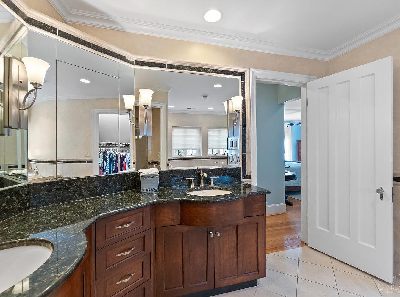 A spacious bathroom features a large corner vanity with dark green granite countertops and rich wood cabinetry. Twin undermount sinks are installed in the counter, each with a polished chrome faucet. Above the vanity, a wide expanse of beveled mirrors covers the wall, emphasizing depth and reflecting light from three elegant, frosted glass sconces. The neutral beige walls are finished with crown molding and bordered with contrasting black granite trim. Cream-colored tile flooring complements the wood, while a glimpse through the open door reveals a walk-in closet filled with clothing and a sitting area with light blue walls.