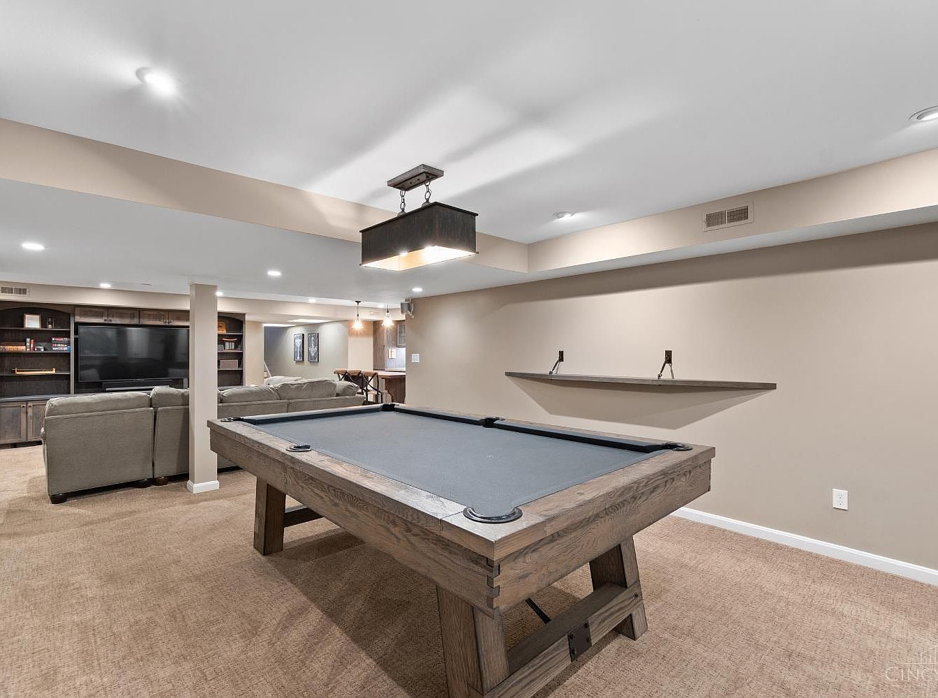 A spacious basement game room featuring a rustic wooden pool table with a dark playing surface as the centerpiece. The space is defined by neutral beige walls and matching carpet flooring, which create a warm, inviting atmosphere. A contemporary rectangular overhead light fixture hangs above the pool table, providing focused illumination. In the background, a cozy lounge area with light gray sectional sofas faces a large flat-screen television set into built-in bookshelves. Minimalist decorations, recessed lighting, and an open layout make the room perfect for recreation, socializing, and entertainment. A floating wall shelf adds a modern touch near the pool table.