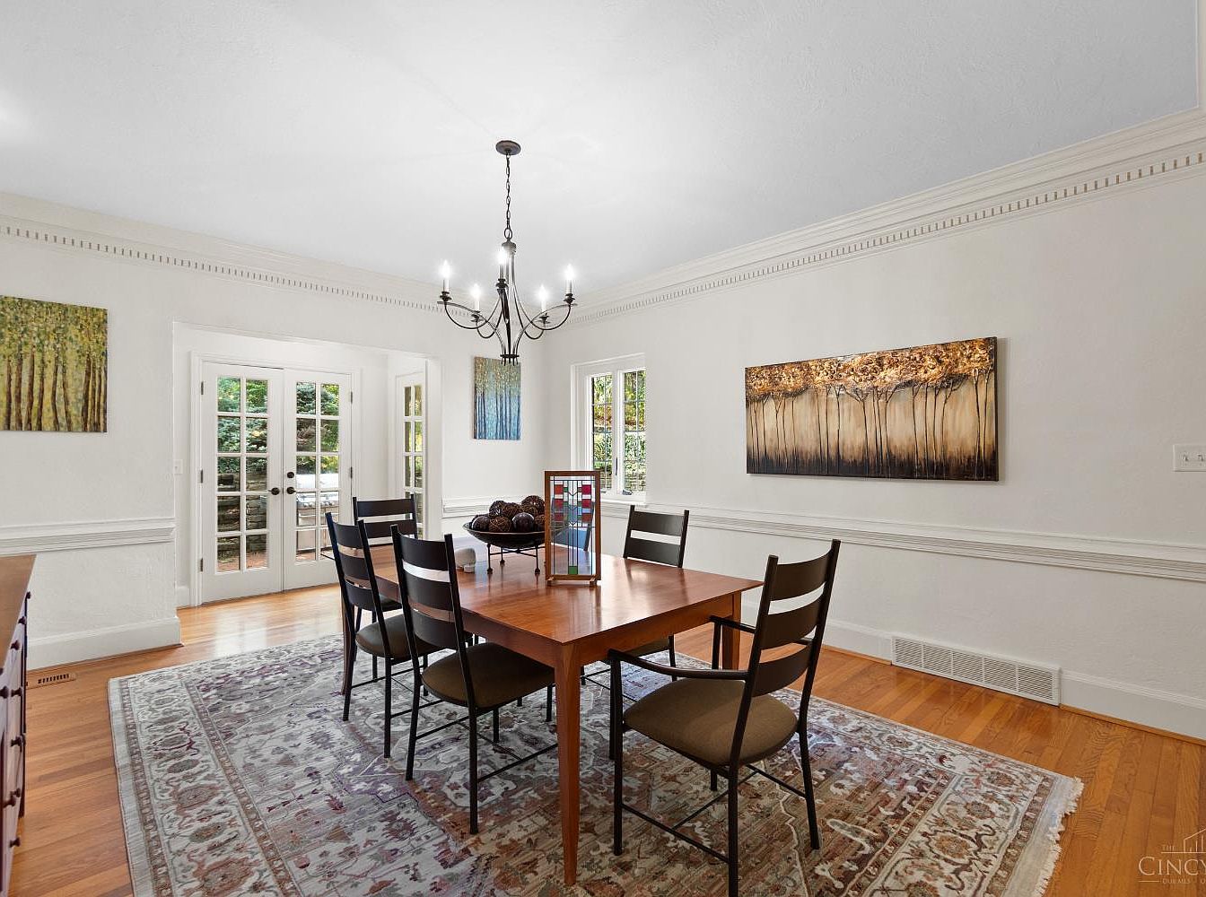 A spacious dining room with a rectangular wooden table and six black metal chairs sits at the center of the space atop an intricate patterned area rug with muted tones. A wrought-iron chandelier hangs above the table, providing an elegant focal point. The room features white walls with classic crown molding and decorative picture rail, adding historic charm. Large French doors fill the room with natural light, offering a view into a garden space beyond. Artworks depicting trees hang on the walls, bringing a subtle natural motif. Hardwood floors add warmth, while the overall palette remains calm and sophisticated.