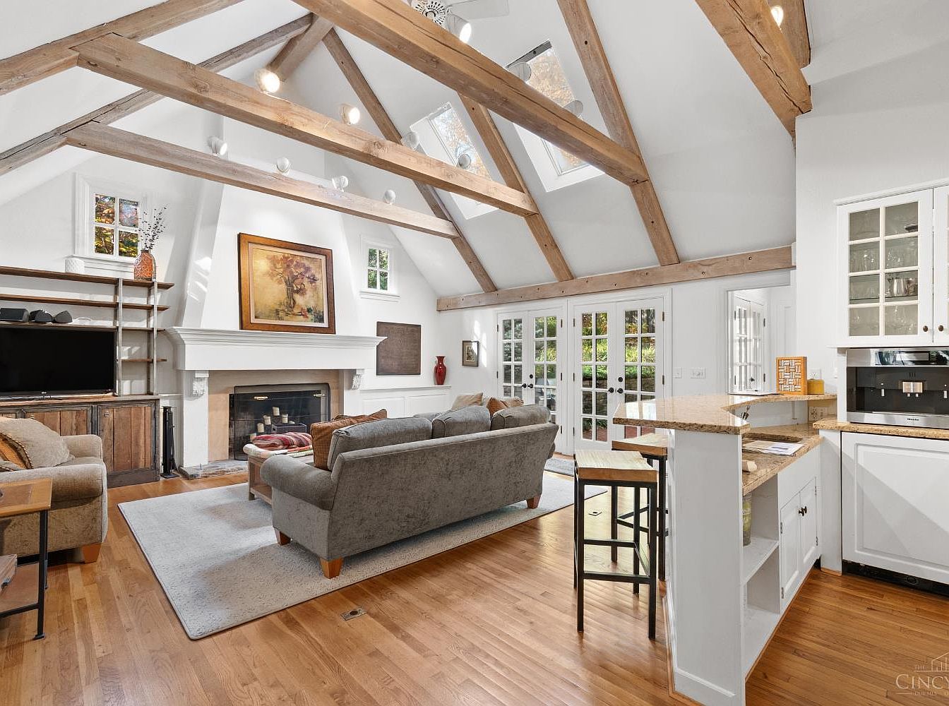 A spacious living room with vaulted ceilings framed by exposed wooden beams and several skylights, allowing natural light to stream in. The room features a large stone fireplace with a painted white mantel, topped with a classic landscape painting. Two beige sofas and a round ottoman sit atop a pale rug, creating a cozy seating area. The floor is light hardwood, coordinating with the rustic wooden accents. Built-in shelving and cabinetry flank the fireplace, with a television on the left. French doors with glass panes open to the outside, and part of the kitchen with granite counters is visible on the right.