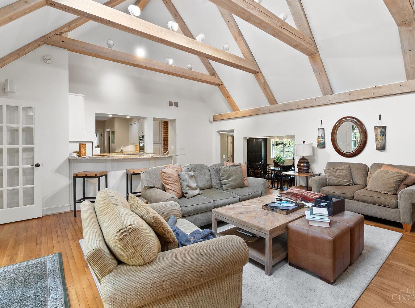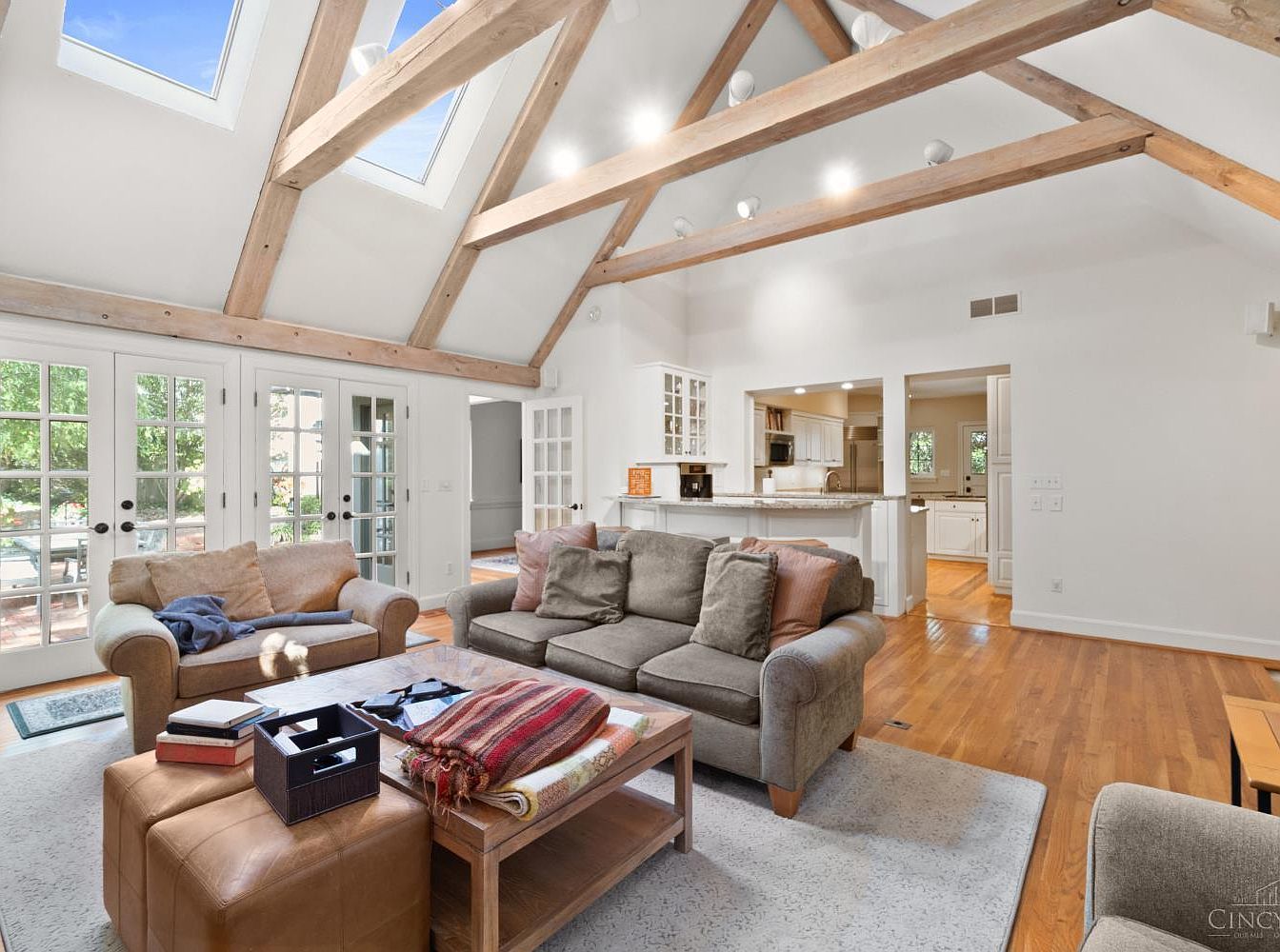 A spacious living room with vaulted ceilings and exposed wooden beams, creating a rustic yet modern ambiance. Natural light fills the space through large skylights and French doors that open to an outdoor area. The design features a neutral palette with white walls, paired with warm wood floors and soft beige and gray upholstered furniture. The arrangement includes a plush sofa, armchair, ottoman, and a wooden coffee table with a colorful throw and books. The open floor plan leads seamlessly into a bright kitchen with white cabinetry and granite countertops, adding to the airy and inviting aesthetic.