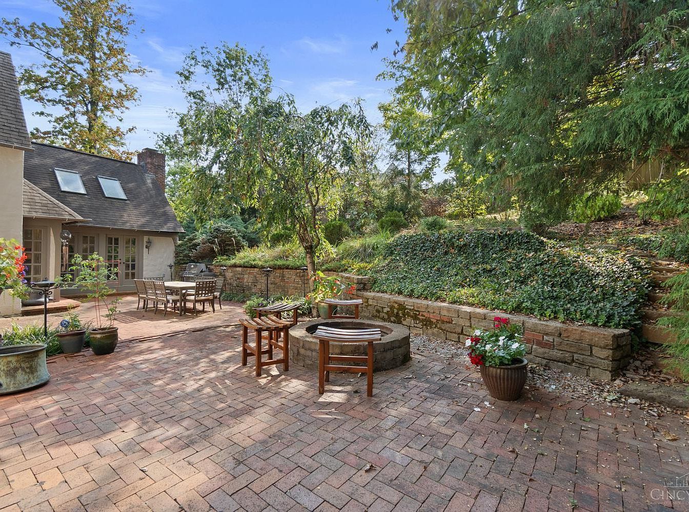 A spacious outdoor patio features red brick paving and a circular stone fire pit surrounded by wooden benches, fostering a cozy and inviting atmosphere for gatherings. To one side, a dining table with six chairs sits near a set of French doors leading into the house, with a barbecue grill close by for outdoor cooking. The backdrop includes a low retaining wall made of rustic stone, filled with lush greenery, low-lying ivy, and a few potted flowering plants that add soft color accents. Tall mature trees and neatly landscaped shrubs provide natural shade and a feeling of privacy.