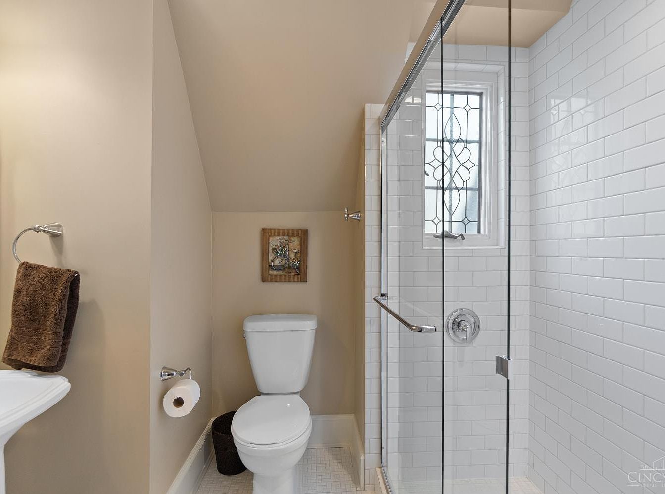 This small, efficiently designed bathroom features beige walls paired with crisp white trim, a white toilet, and a corner-mounted pedestal sink partially visible on the left. Brown accents such as the plush towel and waste bin add warmth. The glass-enclosed shower is lined with classic white subway tiles and includes a striking frosted window with leaded glass details, bringing in light while maintaining privacy. A single framed picture hangs above the toilet, providing a touch of personality. The angled ceiling creates a cozy atmosphere, typical of historic homes with unique architectural lines.