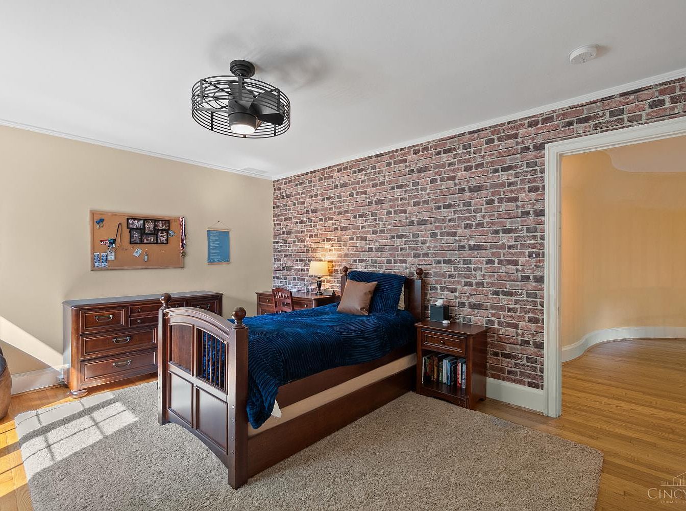 A cozy bedroom features a striking brick accent wall behind the bed, infusing the space with rustic charm and texture. The room is anchored by a dark wooden bed, complemented by a matching nightstand and dresser with classic lines. Navy blue bedding and throw pillows add a rich contrast, while a soft beige carpet covers much of the hardwood floor. The opposite wall is painted a warm beige, adorned with a bulletin board and a framed piece. Natural light pours in, accentuating the sleek, modern black ceiling fan and creating an inviting, softly industrial atmosphere.