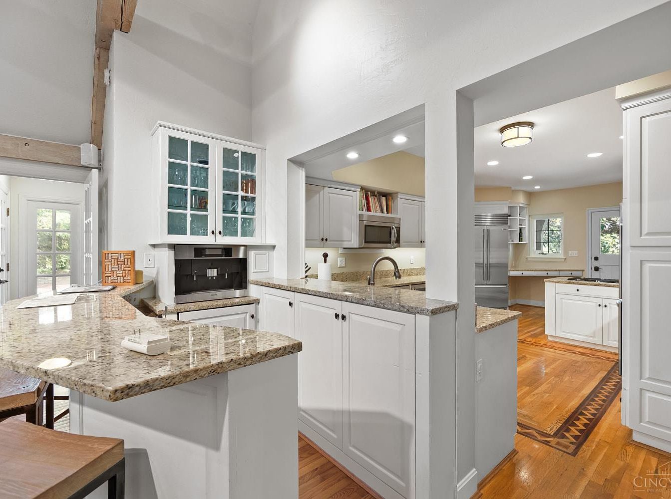 Spacious kitchen with light tan granite countertops and crisp white cabinetry throughout. The room features a breakfast bar with wooden stools, a coffee station built into the cabinetry beneath glass-front upper cabinets, and an open layout that connects to a larger kitchen area beyond. The wood floor adds warmth, complemented by exposed ceiling beams. Recessed lighting, a stainless steel refrigerator, and a farmhouse-style door with glass panes provide a bright, inviting atmosphere. Subtle beige walls and decorative crown molding frame the modern yet classic aesthetic, while open shelves and alcoves offer additional storage and architectural detail.