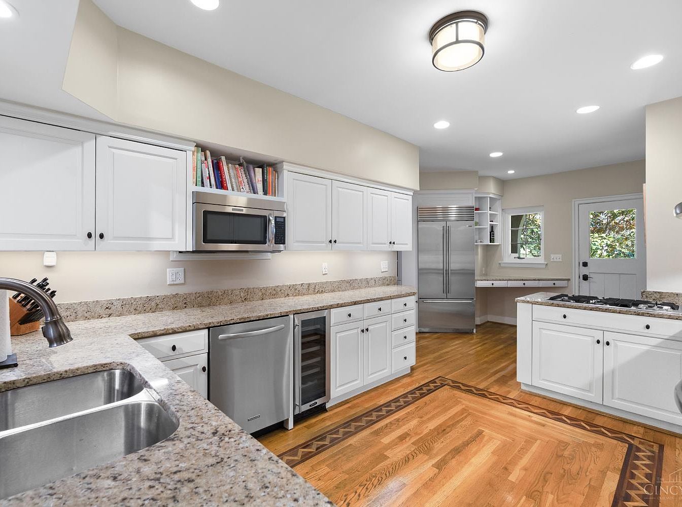 Spacious kitchen featuring sleek granite countertops and white shaker-style cabinetry with simple black knobs. The layout includes a double sink, built-in stainless steel appliances—a dishwasher, wine fridge, refrigerator, and a microwave. The cooktop is on a large island, allowing for ample counter space and easy movement. Open shelving houses cookbooks above the microwave. Warm-toned hardwood flooring adds texture, accentuated by an intricate inlaid border pattern. Subtle beige walls and recessed ceiling lights create a clean, bright atmosphere. The back wall includes a cozy workspace under a window, and a door provides access to outside, bringing in natural light.