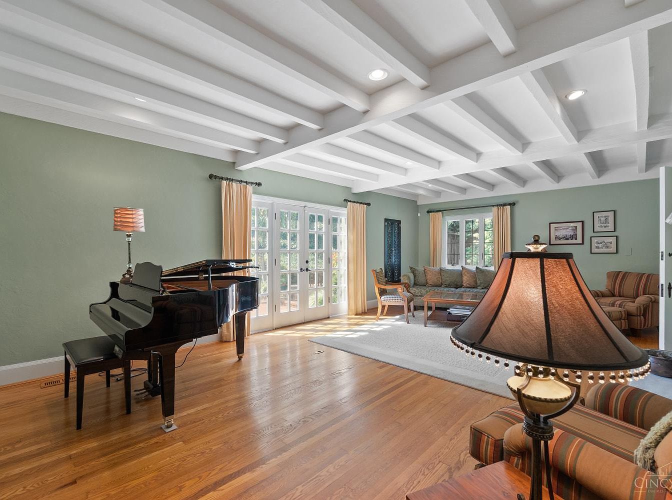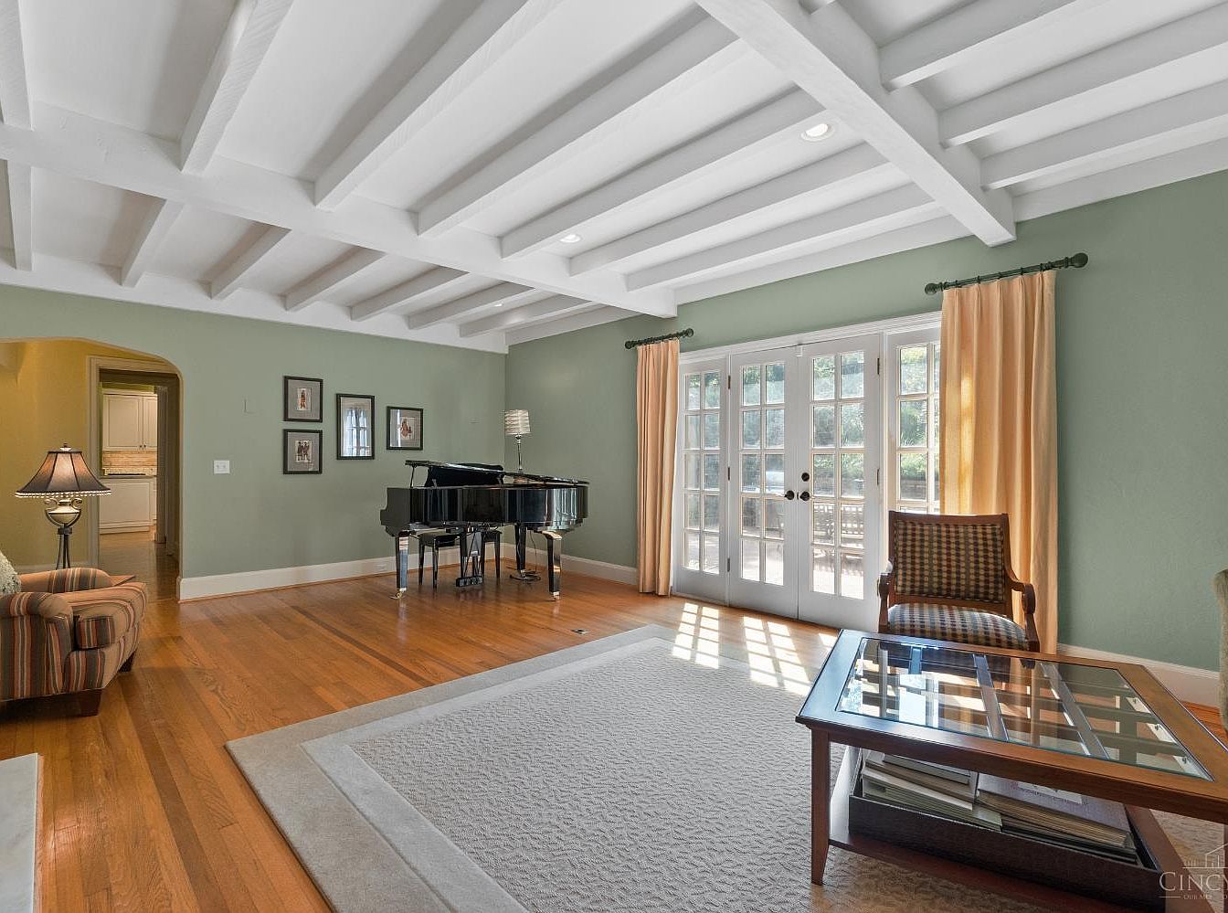 A spacious living room features sage green walls, white beamed ceiling, and honey-toned hardwood floors. Natural light pours in through a wall of French doors outfitted with light beige curtains, creating an airy and inviting atmosphere. A plush area rug sits centered on the floor, with a patterned armchair and glass-top coffee table close by. In one corner, a black grand piano adds a refined touch, complemented by framed artwork on the walls. An archway leads to another part of the house, and a striped sofa with a stylish lamp completes the cozy, traditional decor.