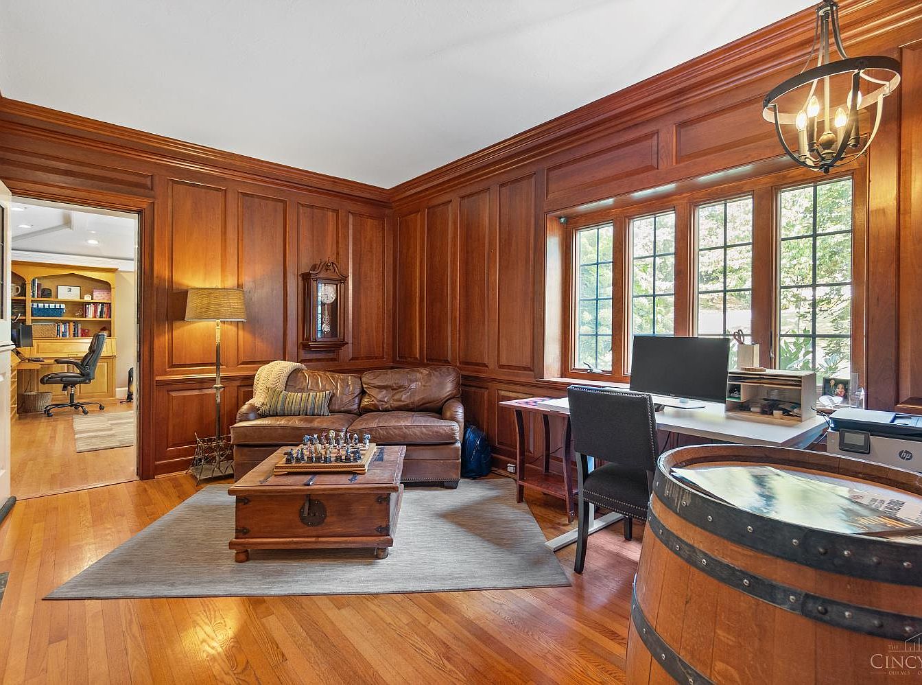 Rich wood paneling lines the walls, giving the room a warm, stately ambiance. A plush brown leather sofa sits against one wall, complemented by a rustic wooden coffee table topped with a chess set. Adjacent to the sofa, a tall floor lamp offers soft lighting next to a classic wall clock. Large multi-pane windows flood the space with natural light, highlighting the elegant woodwork. A modern desk with computer equipment is placed in front of the windows, paired with a dark upholstered chair. Foreground elements include a unique barrel table, while an arched doorway leads to an additional office nook.