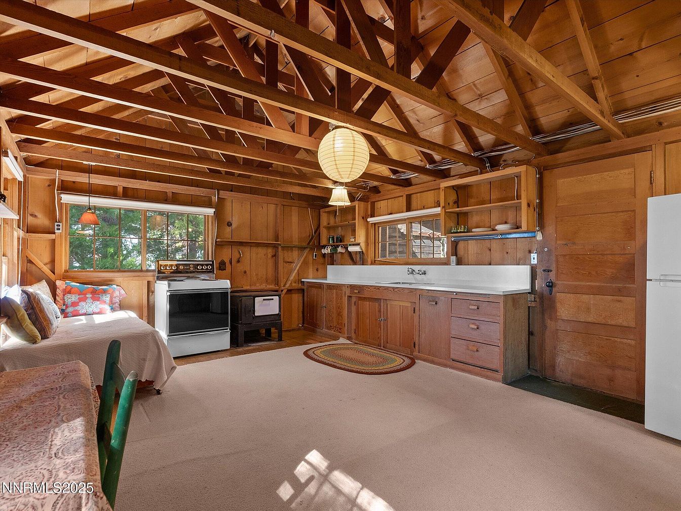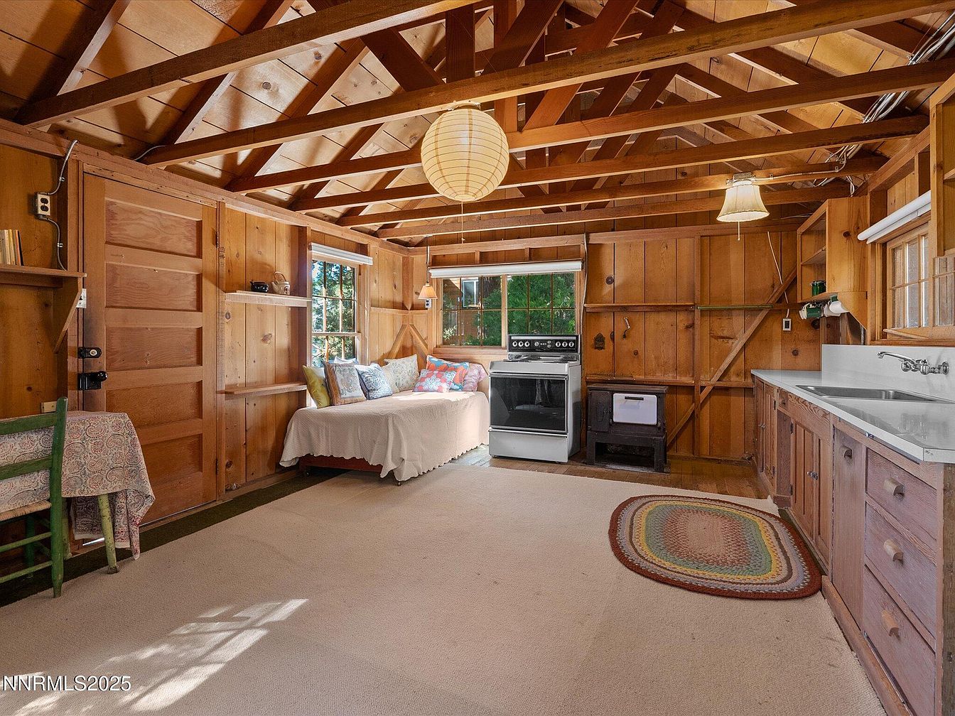 Open-concept space with rich wooden paneling and exposed ceiling beams for a rustic, cozy ambiance. Light streams through two large windows, brightening the natural wood tones. A daybed with assorted colorful throw pillows sits beneath the windows, offering a comfortable lounging area. Mid-century appliances, including a classic stove and a small wood-burning unit, highlight the vintage character. White countertops and a stainless-steel sink run along one wall. A round braided rug adds warmth and brings together the space, while open shelves and pendant lights lend a welcoming, homey touch. The overall effect is charming, nostalgic, and functional.