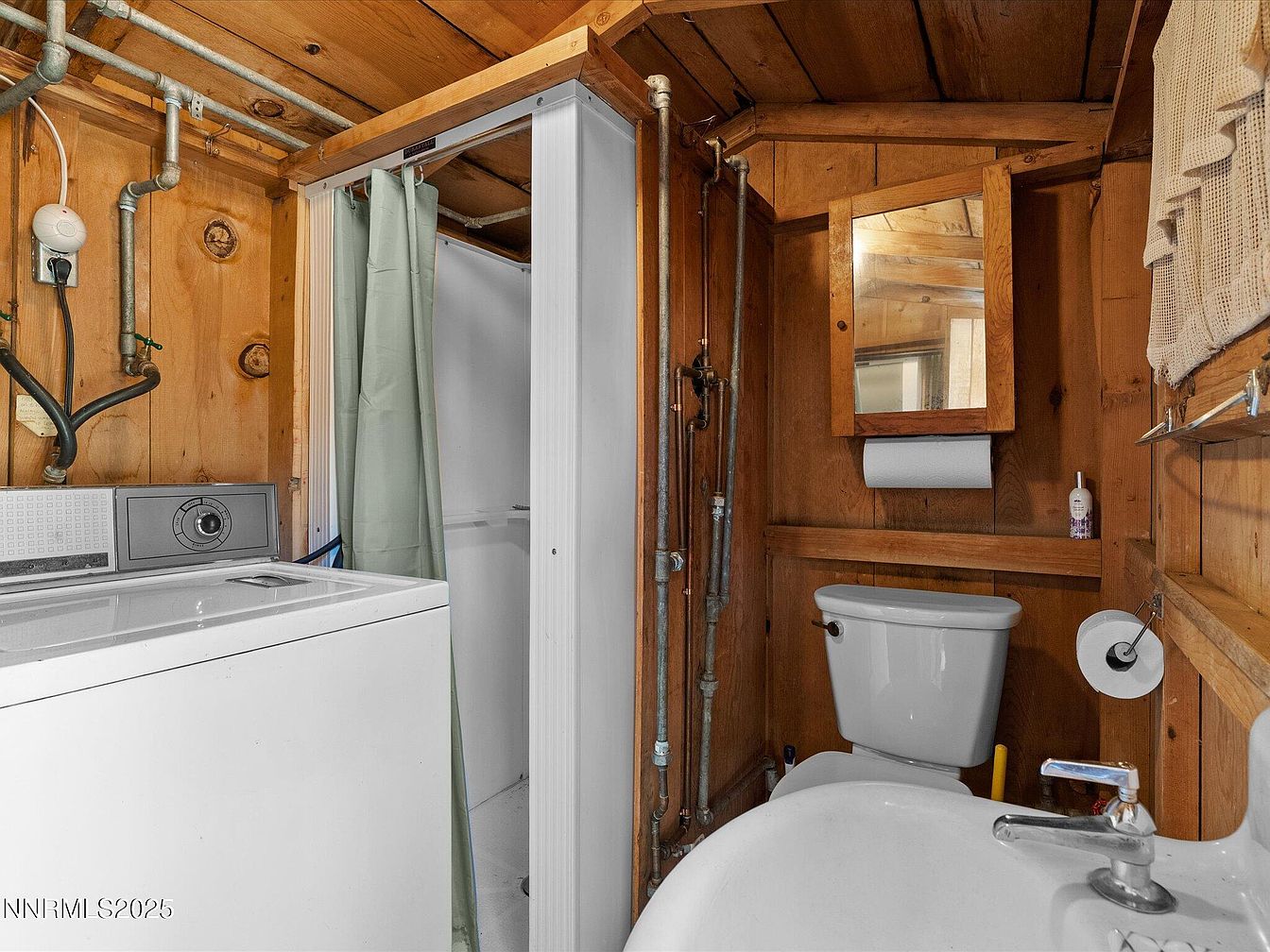 A compact multipurpose room with rustic wooden walls and ceiling, featuring exposed pipes and rough-hewn planks adding a vintage cabin feel. On the left, a top-loading washing machine sits beneath exposed plumbing, with a small shower stall next to it, enclosed by a pale green curtain. Adjacent is a white porcelain toilet, mounted below a wooden medicine cabinet with a mirror and paper towel holder. A white porcelain sink occupies the foreground. Natural wood tones dominate, with minimal decorative elements except for a soft beige towel on the wall and a small bottle of soap. The overall look is utilitarian and rustic.